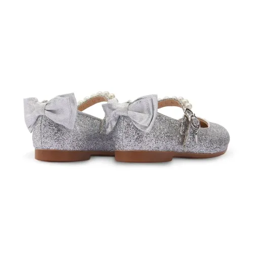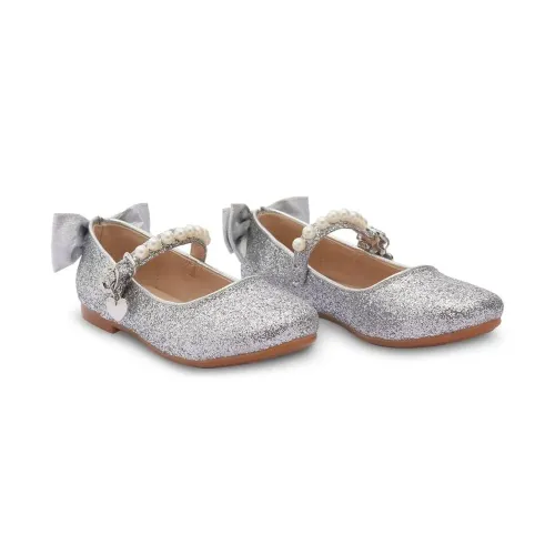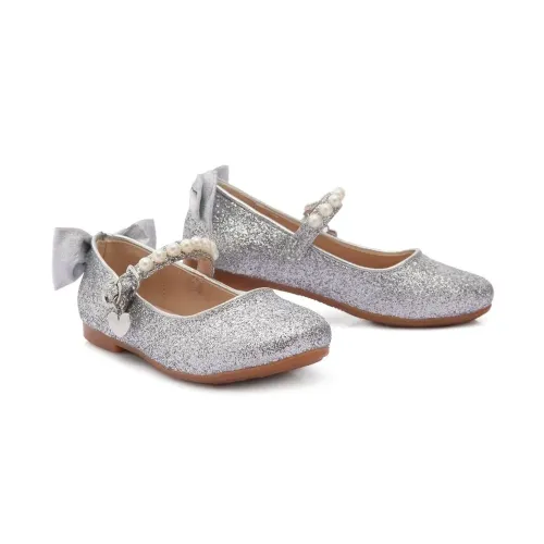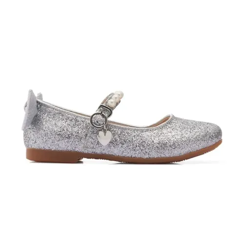 Серебристый, детали из бисера, бант, блестящий материал, закругленный носок, застежка с пряжкой спереди и резиновая подошва.