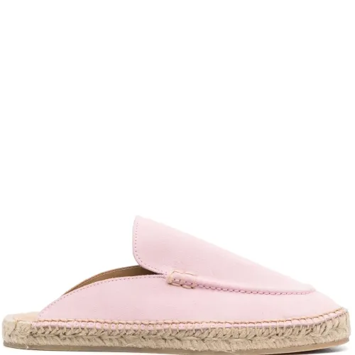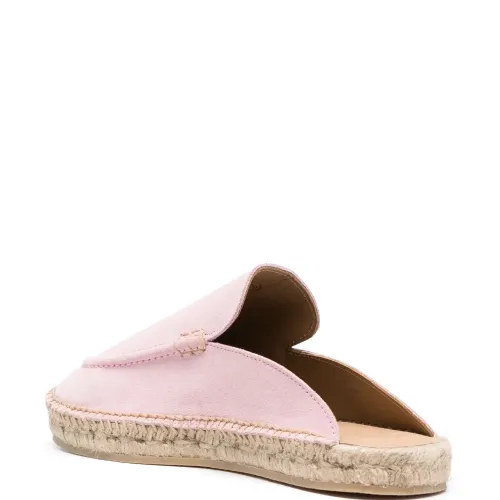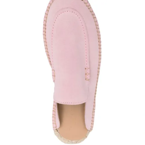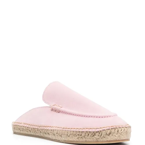 Светло-розовый, замша, модель без застежки, закругленный носок, стелька с логотипом и плетеная подошва из рафии.