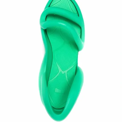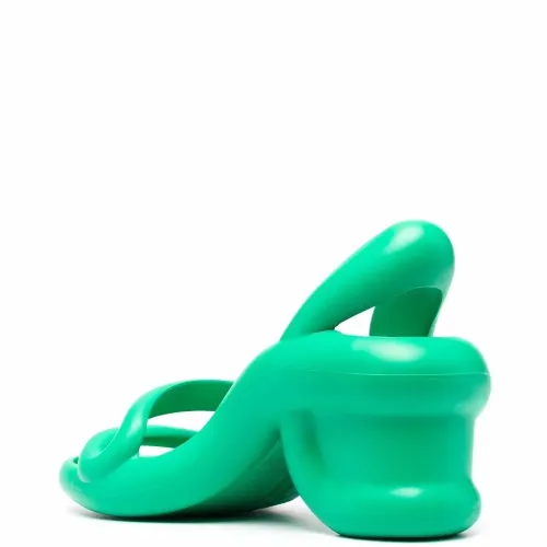 Ремешок на пятке, открытый носок, стелька с логотипом и наборный каблук средней высоты. Цвет: зеленый.