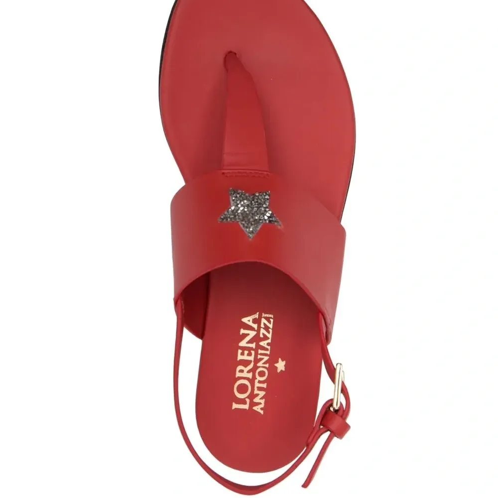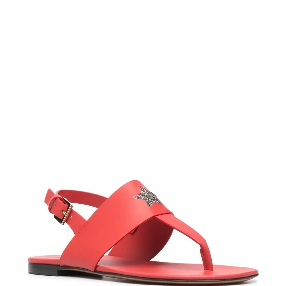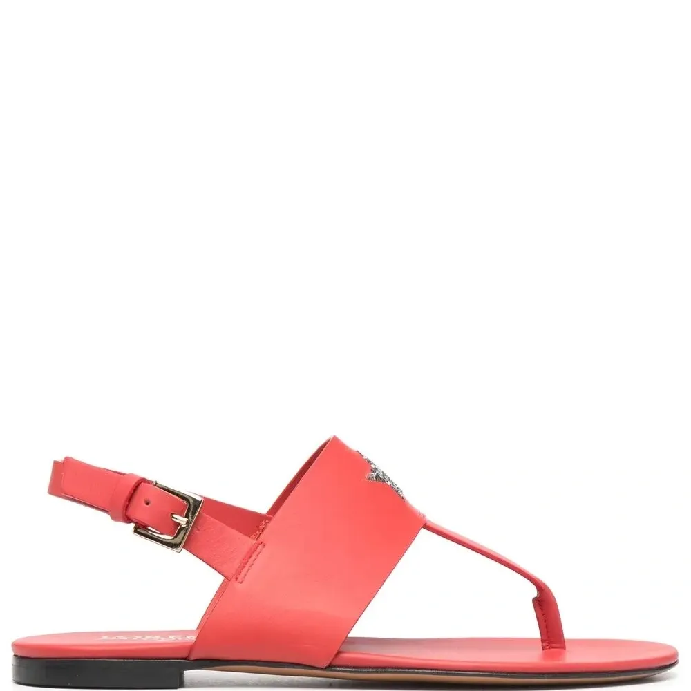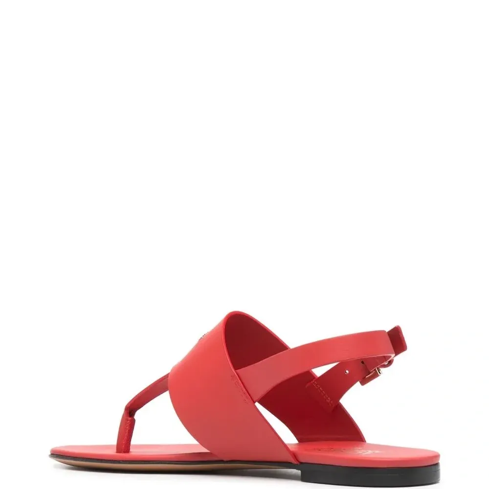 Логотип из заклепок, открытый носок, ремешок на щиколотке с пряжкой и плоская резиновая подошва.