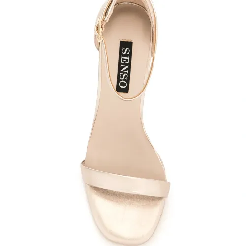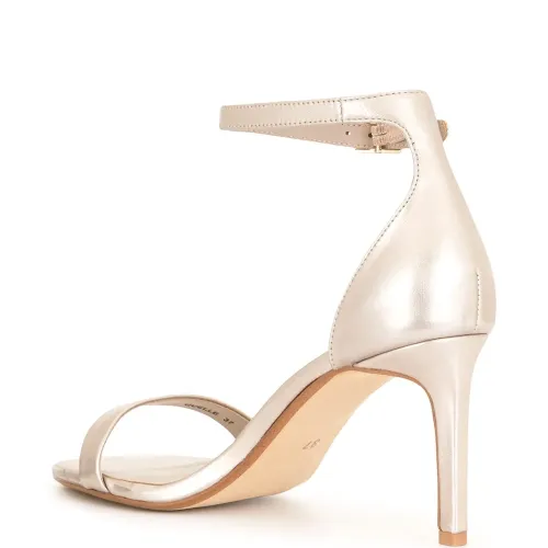 Эффект металлик, открытый носок, стелька с логотипом, боковые застежки с пряжками и высокий каблук. Цвет: серебристый.