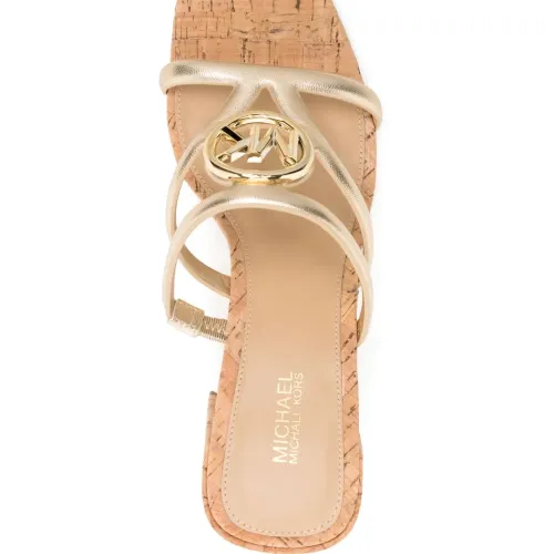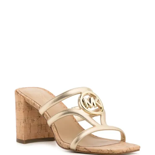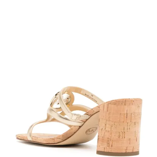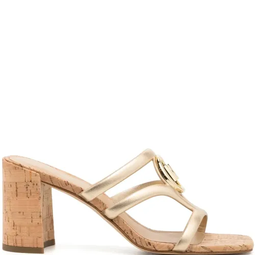 Золотистый, золотистый металлический логотип, открытый носок, квадратный носок, модель без застежки, логотип на стельке, пробковая подошва и каблук средней высоты.