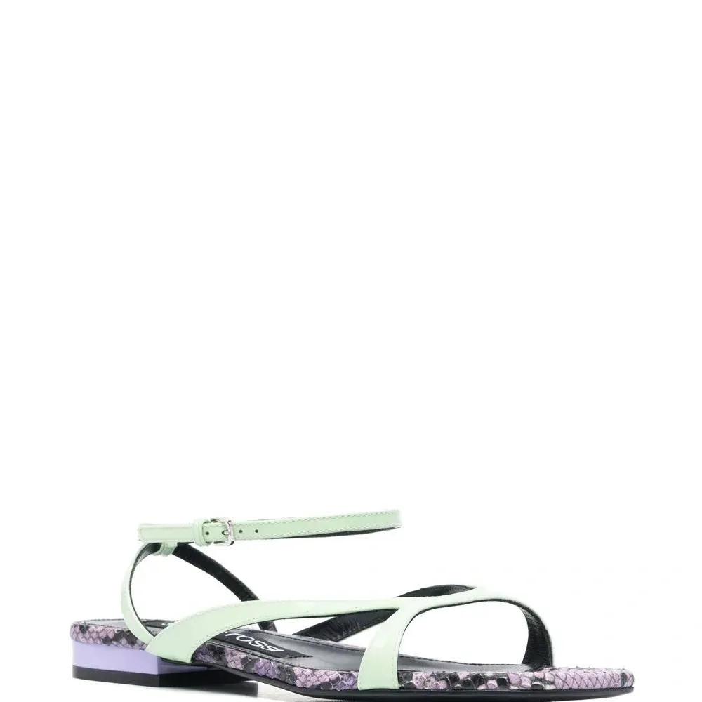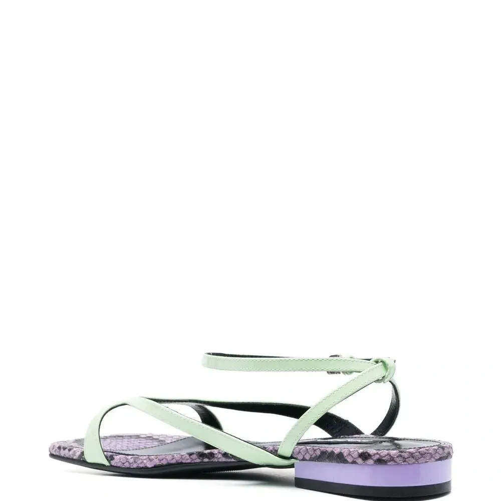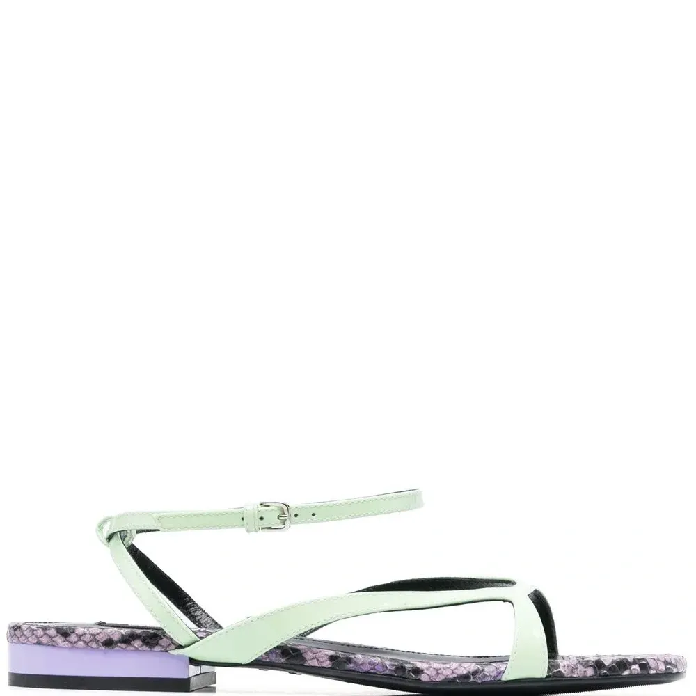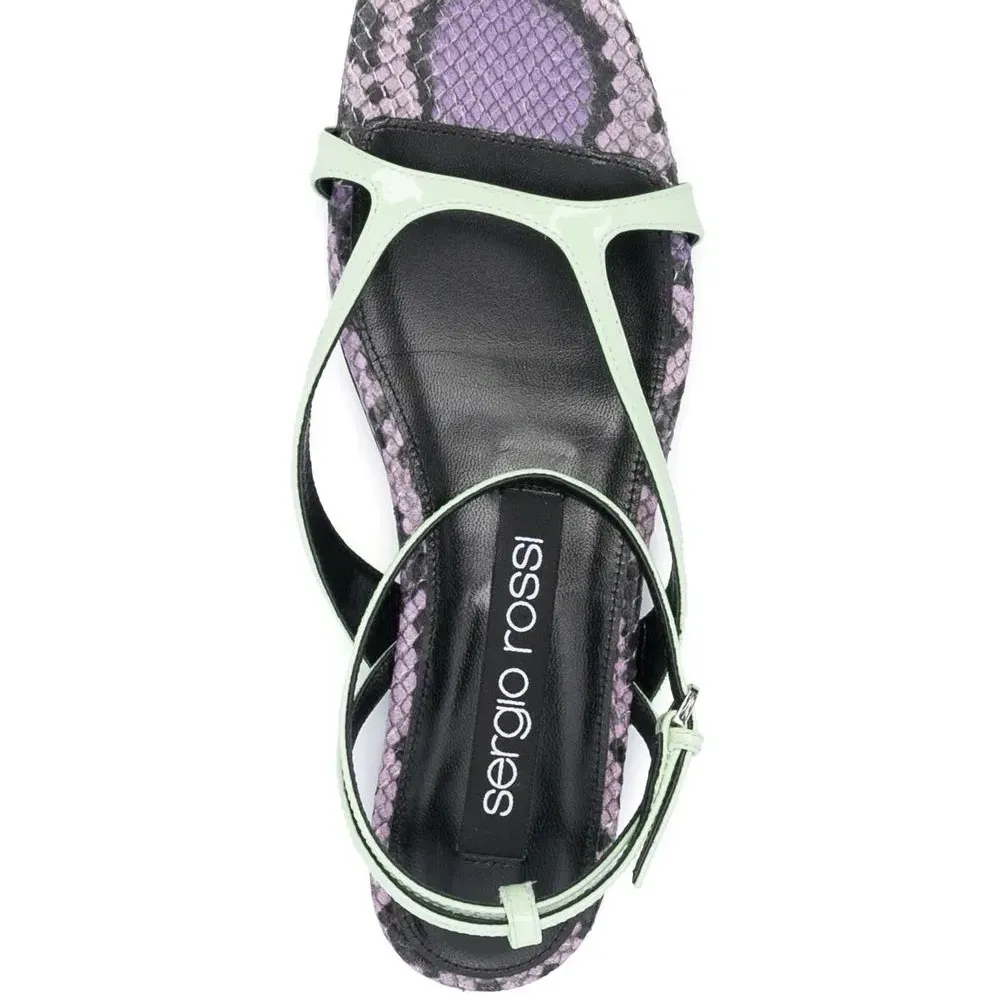 Мятно-зеленый, фиолетовый, телячья кожа, змеиный принт, открытый носок, ремешок на щиколотке с пряжкой, логотип на стельке и кожаная подошва.