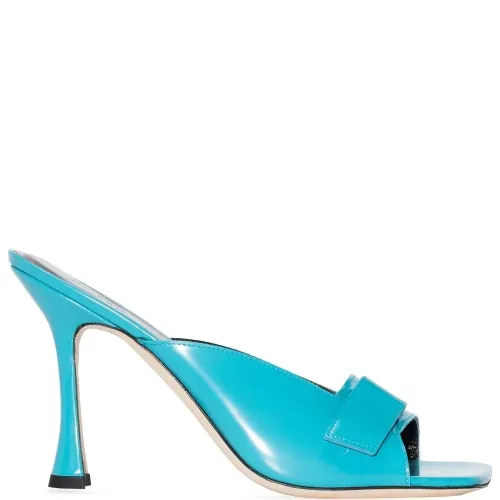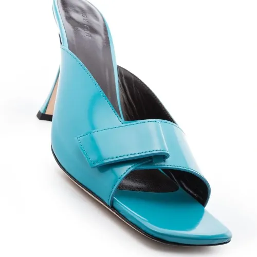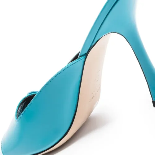 Синий, кожа, открытый носок, квадратный носок и застежка на липучке спереди.