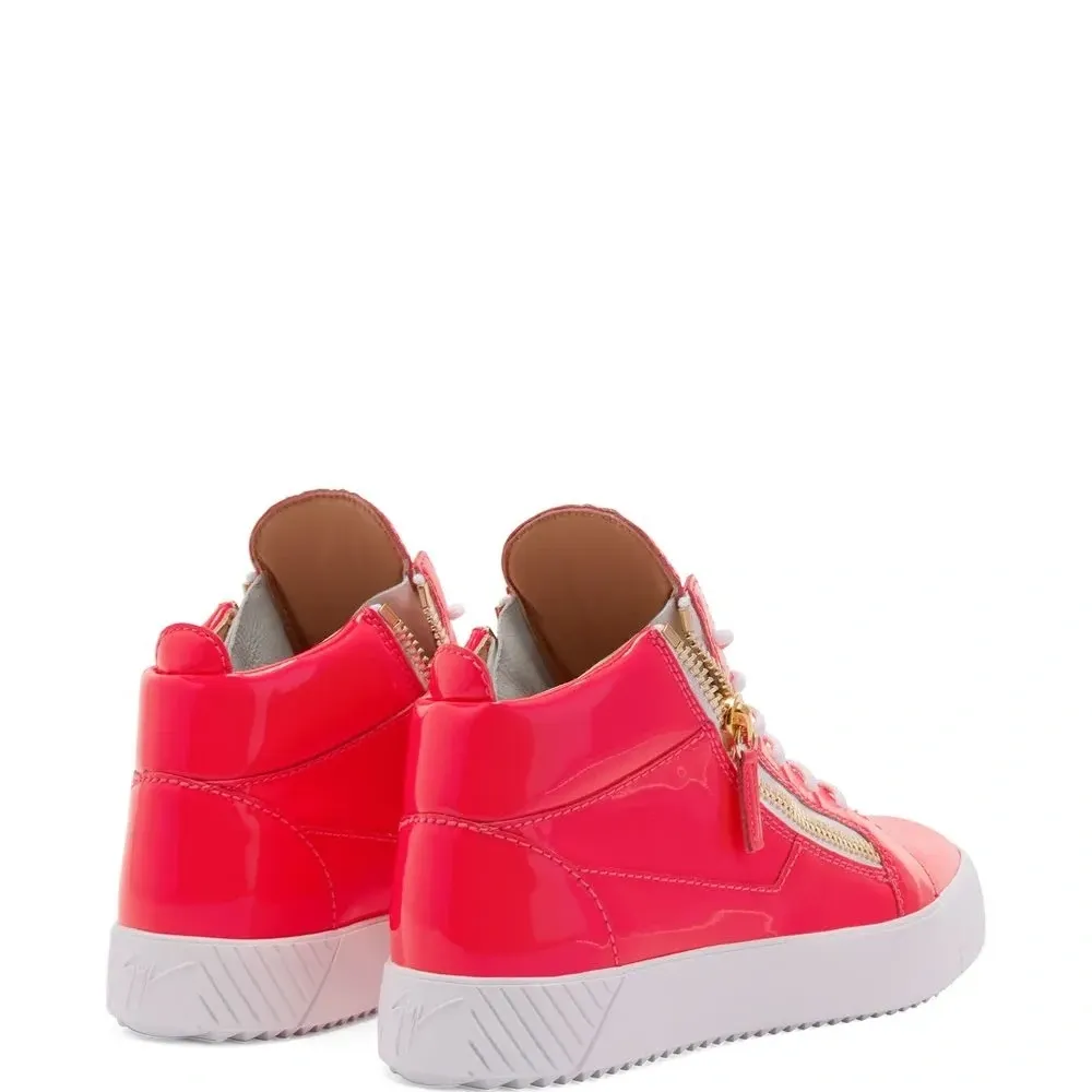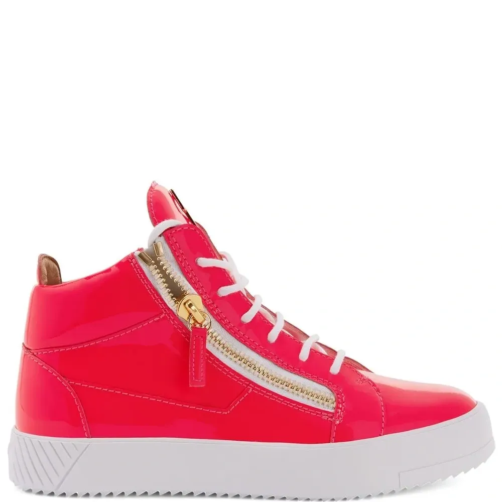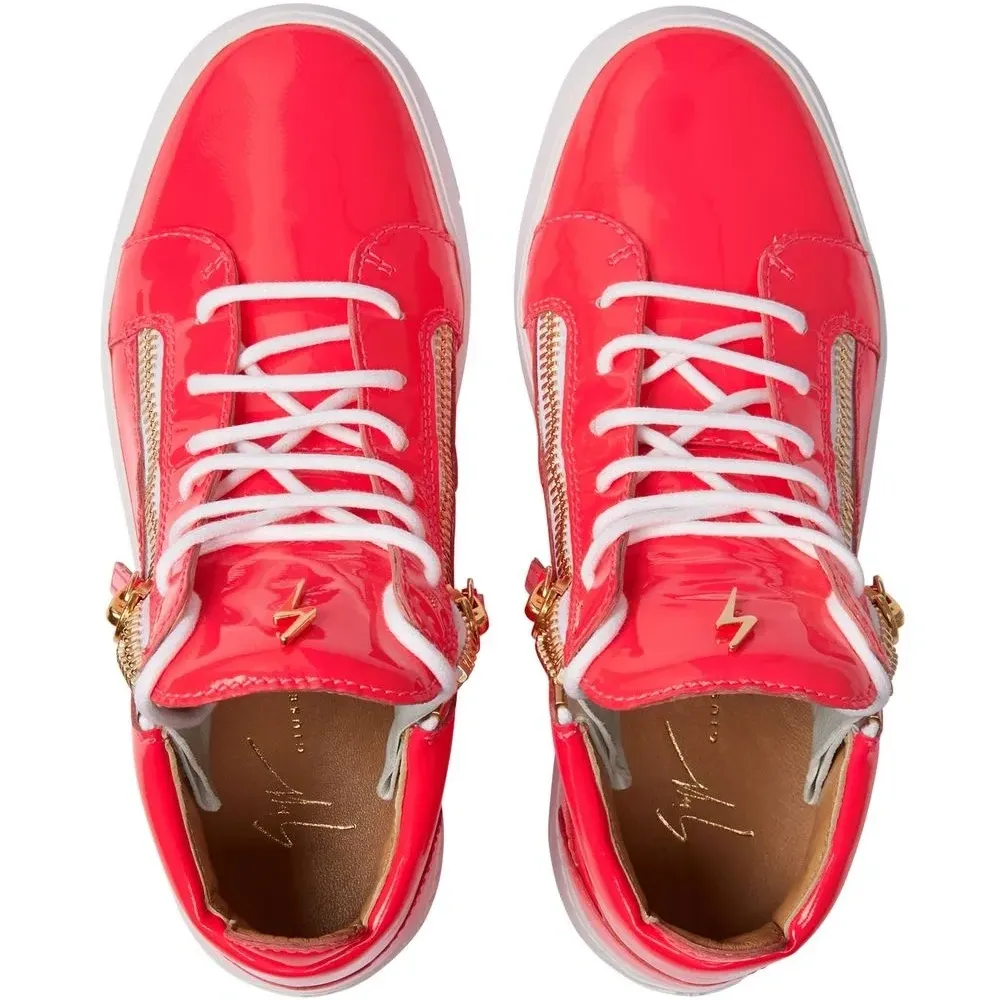 Ярко-красный, лакированная кожа, закругленный носок, шнуровка спереди, металлический логотип на язычке, отделка с декоративной молнией и плоская резиновая подошва.