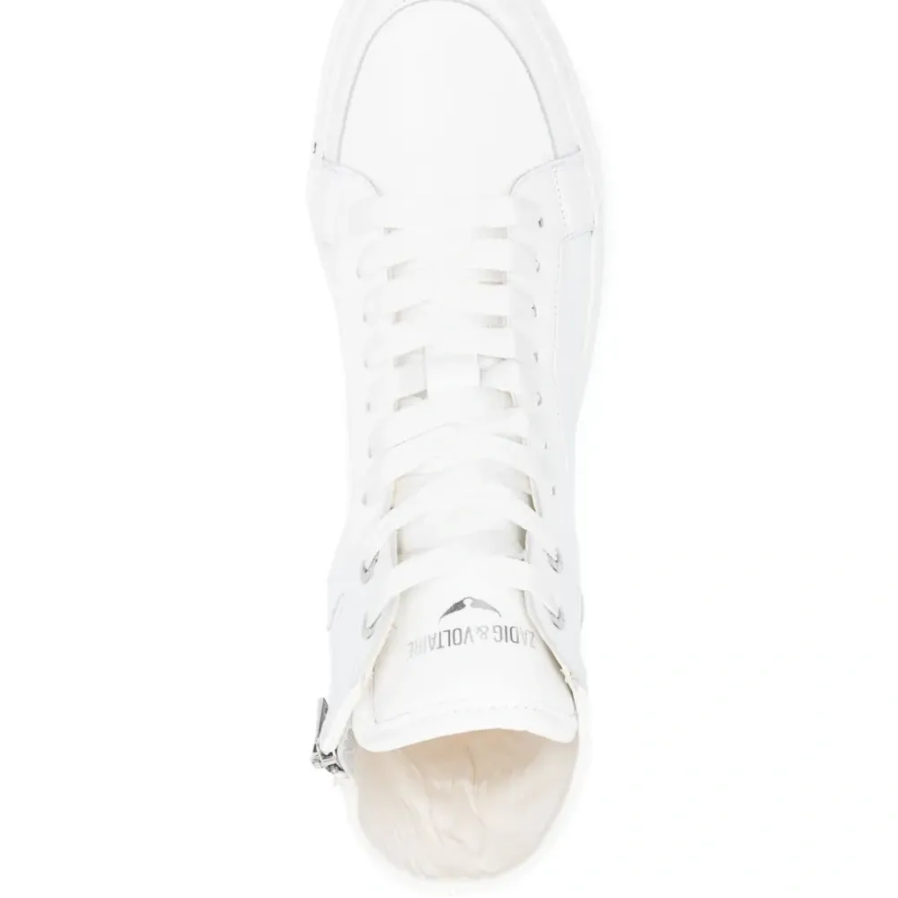 Молочно-белый, телячья кожа, вставки, однотонная расцветка, шнуровка спереди, короткая застежка на молнии сбоку, кожаная стелька с логотипом, плоская резиновая подошва и закругленный носок.
