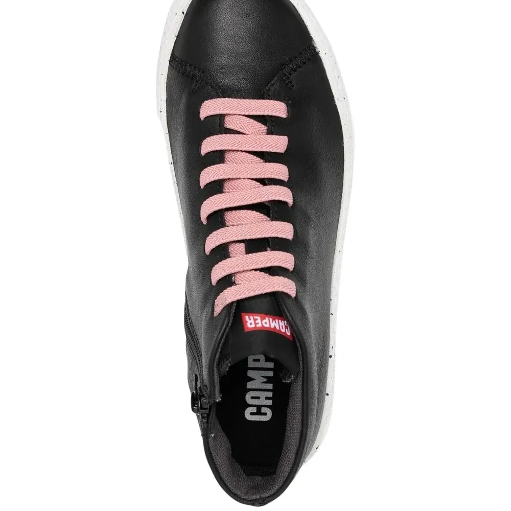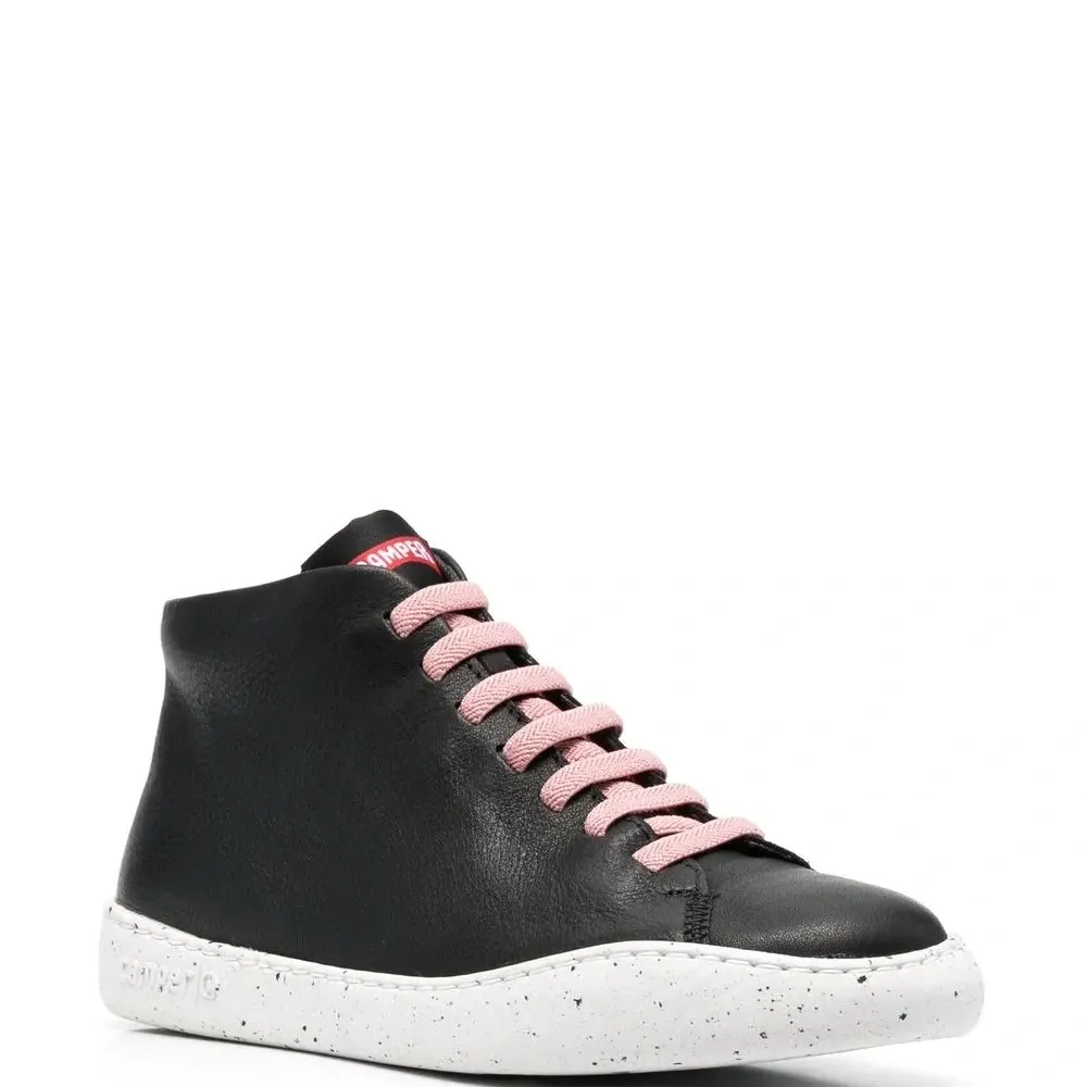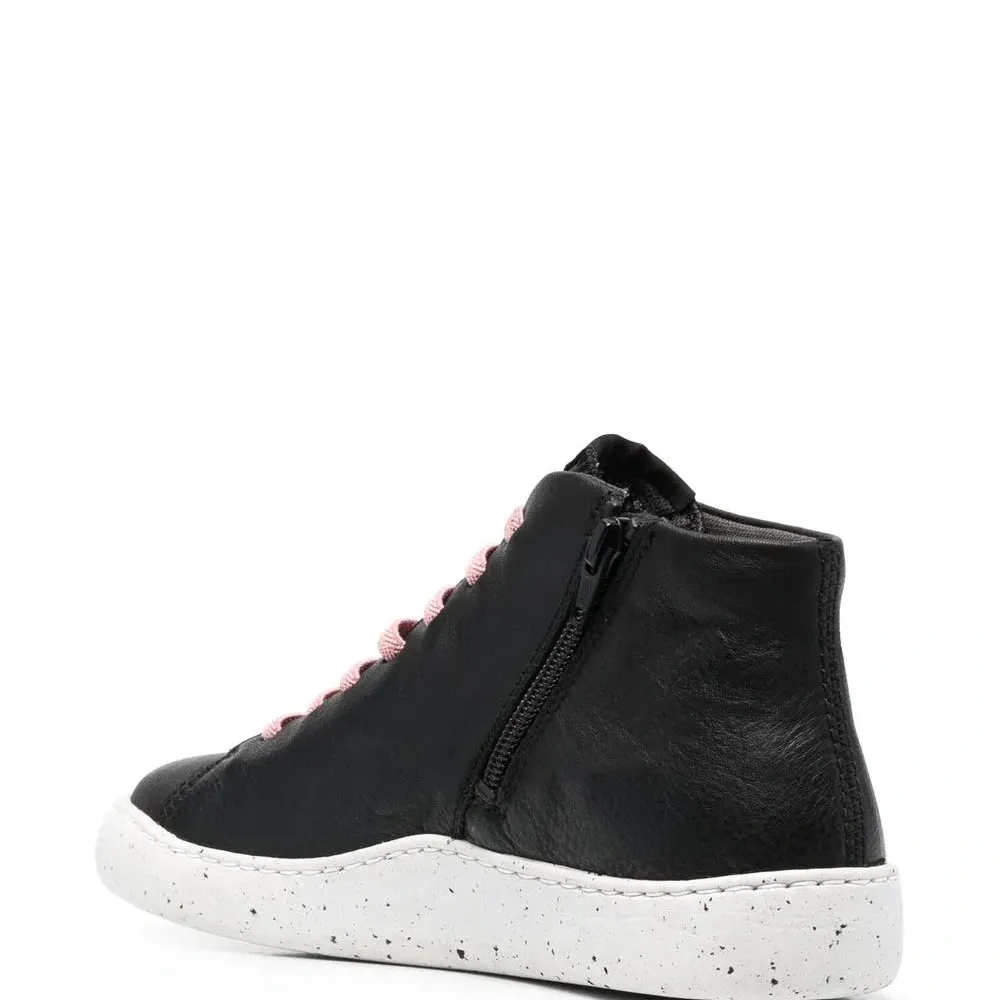 Черный, кожа, закругленный носок, контрастные шнурки, застежка на молнии сбоку, плоская резиновая подошва и длина по щиколотку.