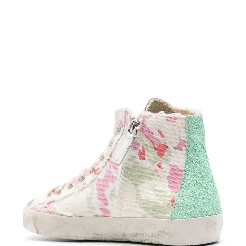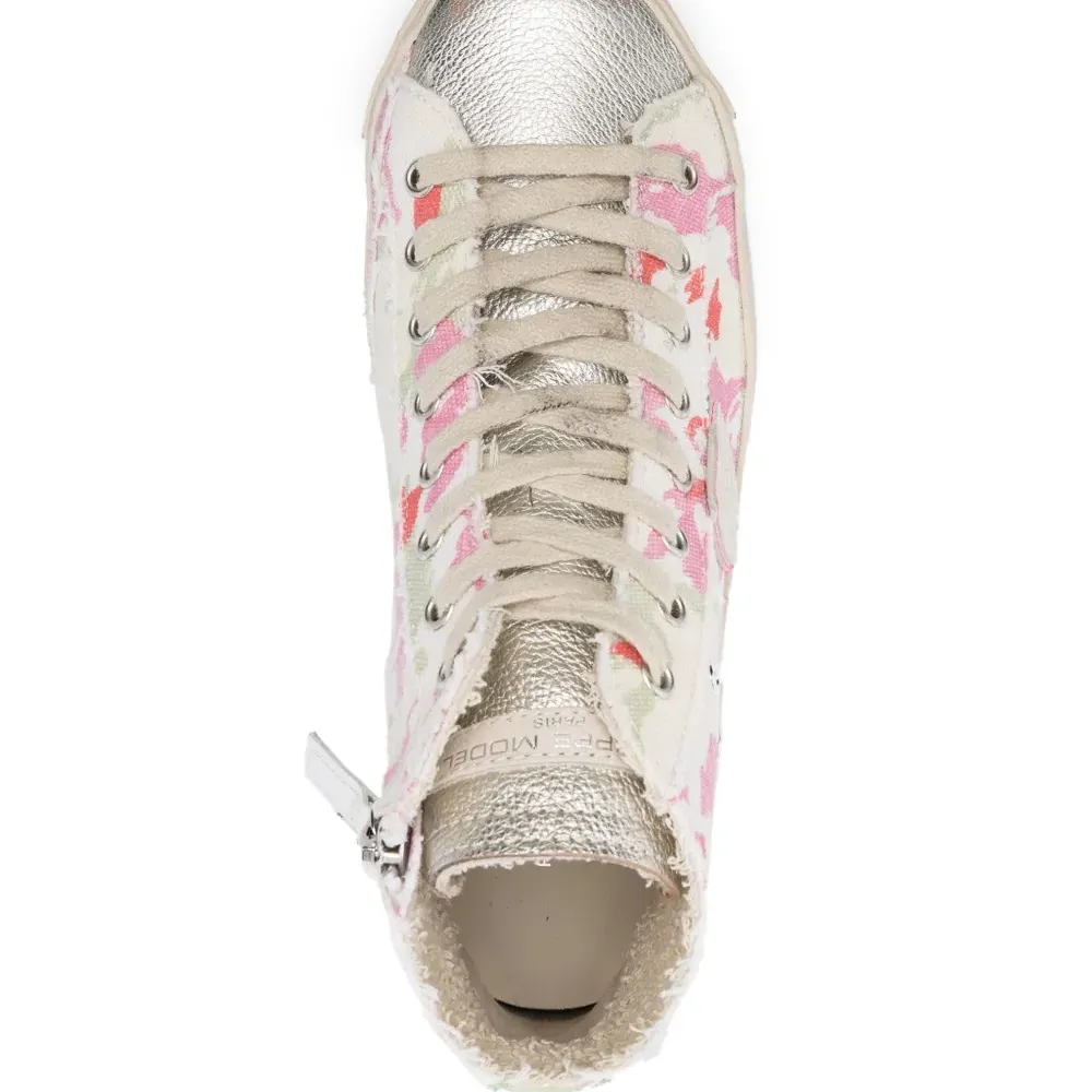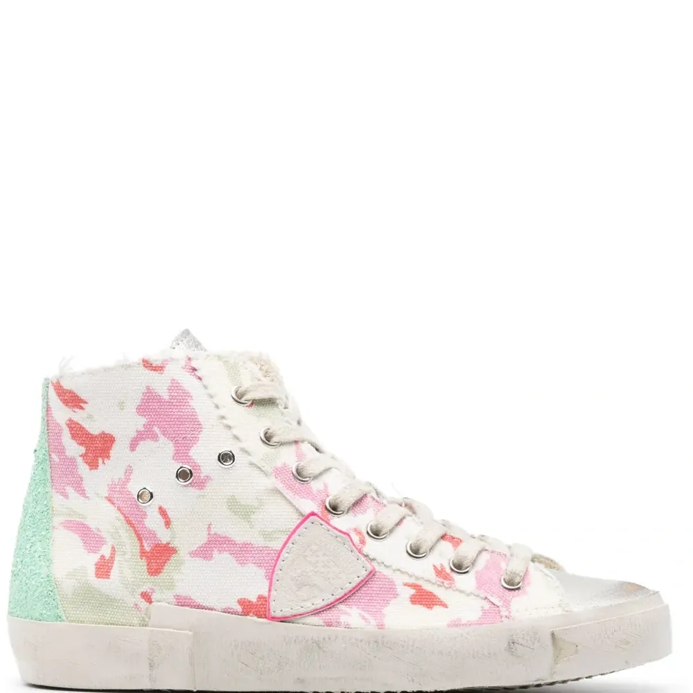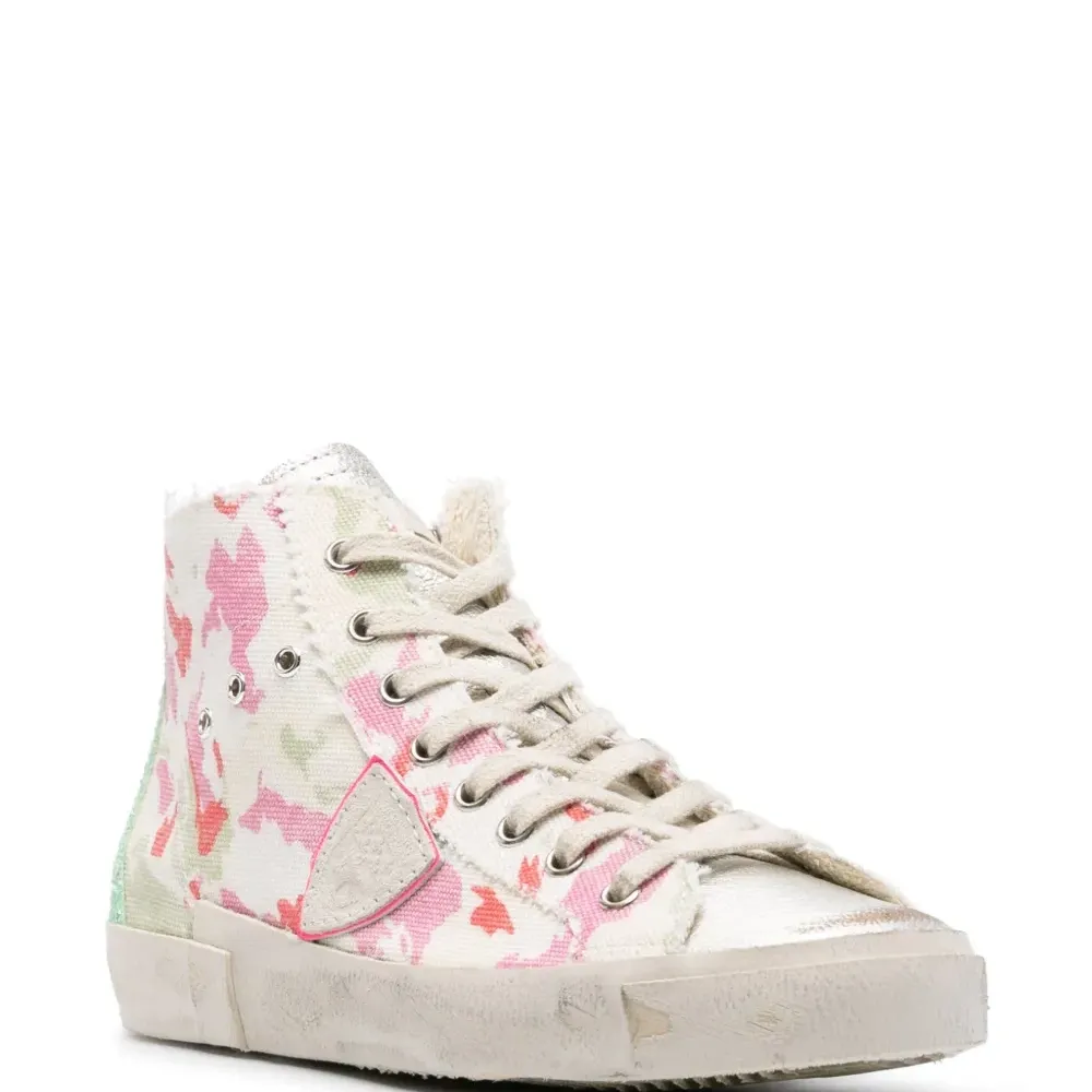 Кремовый, разноцветный, телячья кожа, абстрактный принт, люверсы, нашивка с логотипом сбоку, нашивка с логотипом на язычке, закругленный носок, шнуровка спереди, застежка на молнии сбоку, стелька с логотипом и плоская резиновая подошва.
