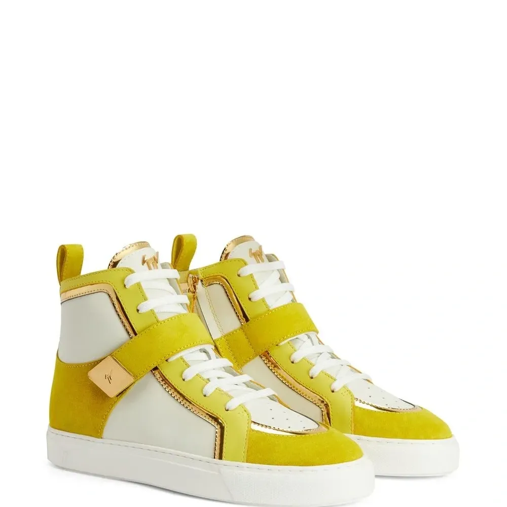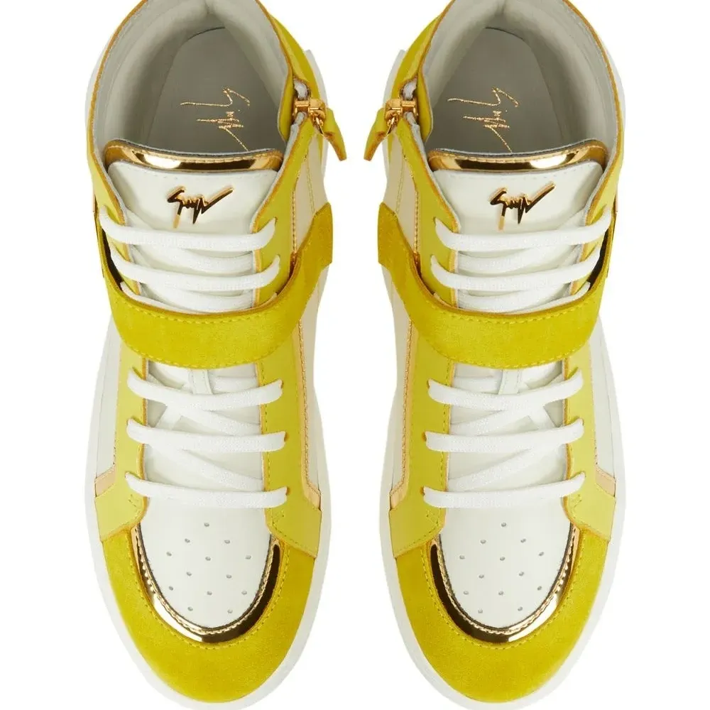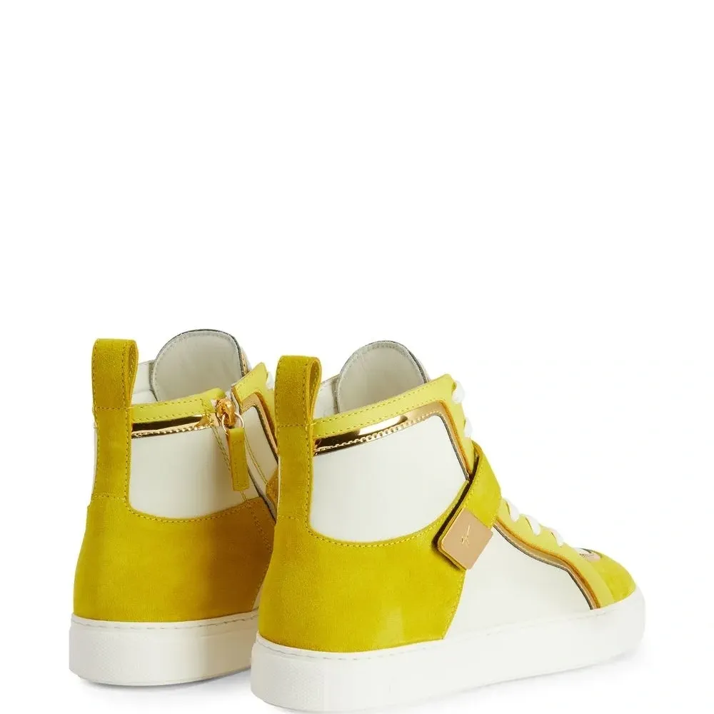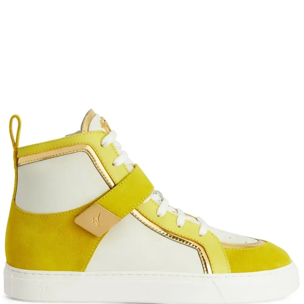 Горчично-желтый, белый, кожа, замшевые вставки, двухцветная деталь, нашивка с логотипом на язычке, петля для подтягивания сзади, закругленный носок, перфорированный носок, застежка на липучке поверх шнуровки спереди и плоская резиновая подошва.