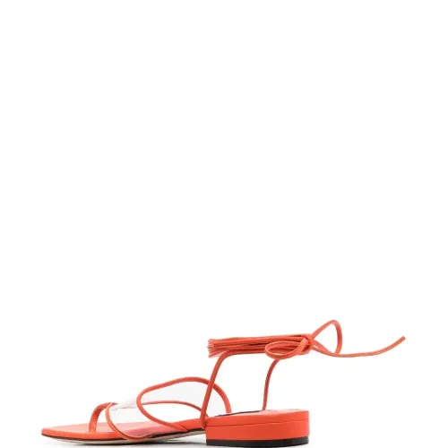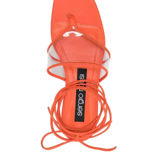 Темно-оранжевый, овечья кожа, прозрачный ремешок , открытый носок, несколько оборотов, завязка на щиколотке, логотип на стельке и кожаная подошва.