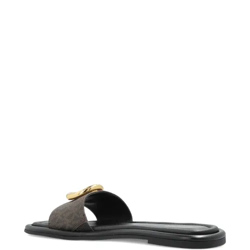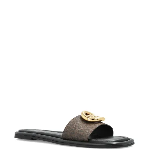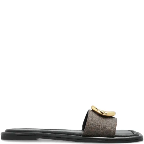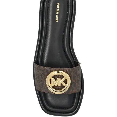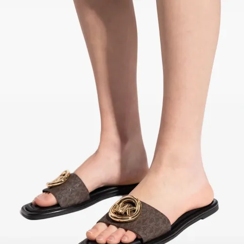 коричневые шлепанцы с открытым носком, плоской подошвой и логотипом