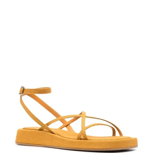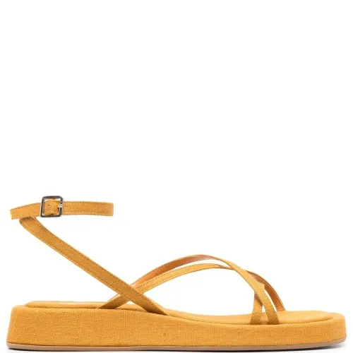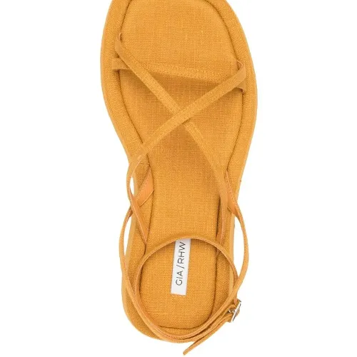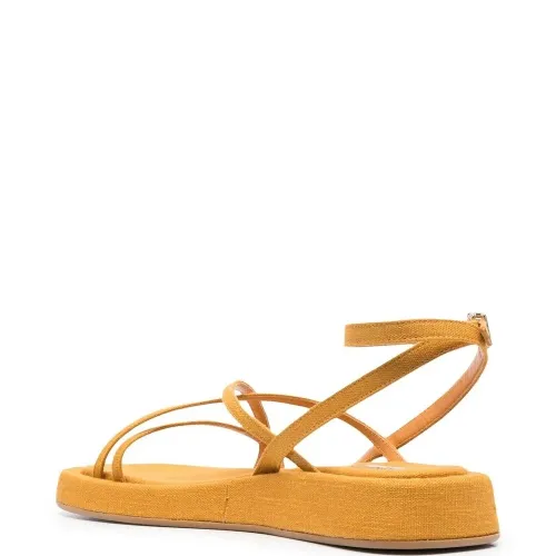 Желтый, парусина, несколько вариантов крепления ремня, открытый носок, ремешок на щиколотке с пряжкой, стелька с логотипом и плоская резиновая подошва.