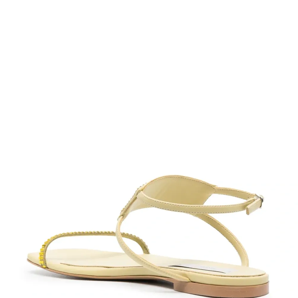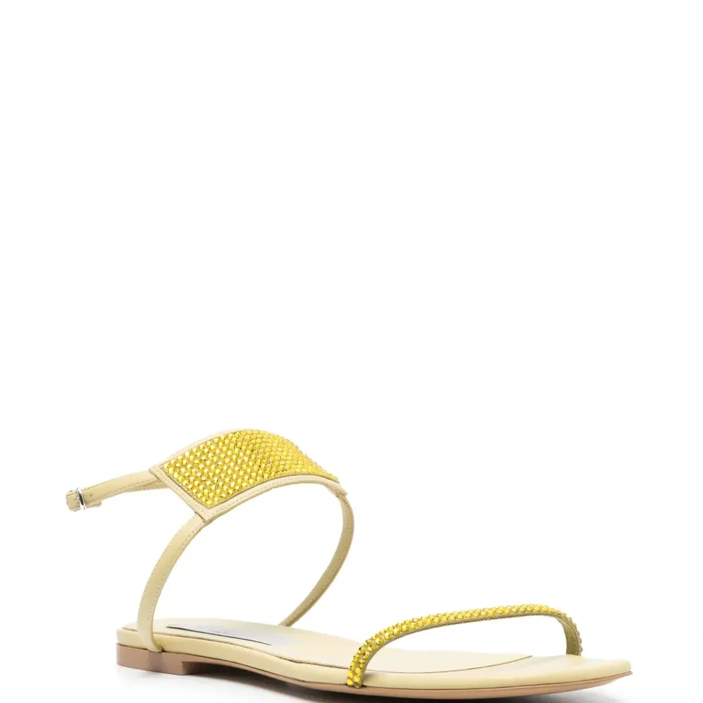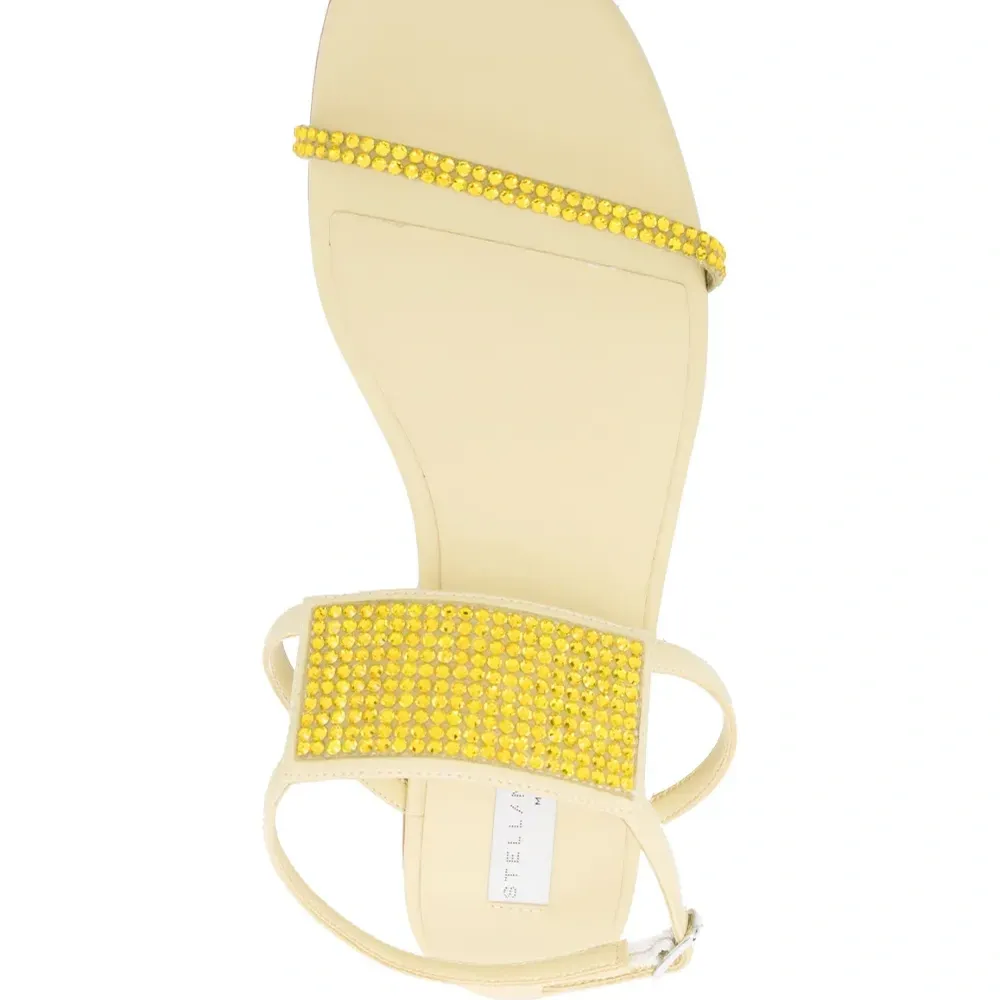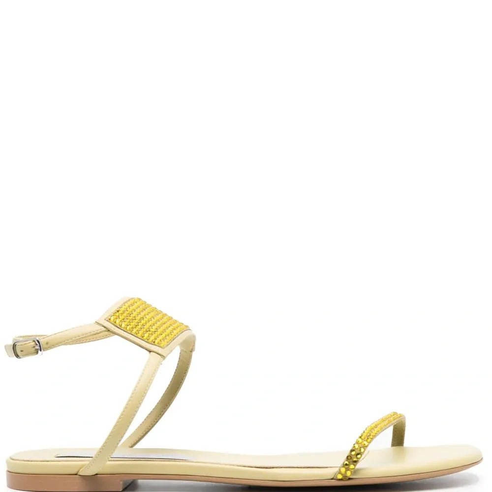 Желтая охра, искусственная кожа, декор из стеклянных кристаллов, открытый носок, ремешок на щиколотке с пряжкой, плоская подошва и стелька с логотипом. Узнать больше о том, какие товары получают отметку «Ответственный выбор», можно из материала «Как мы оцениваем экологичность и этичность».