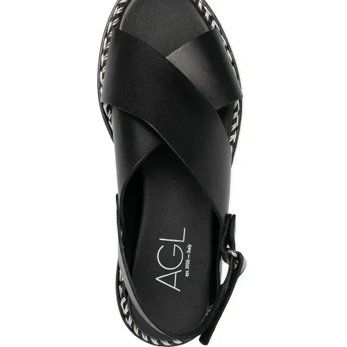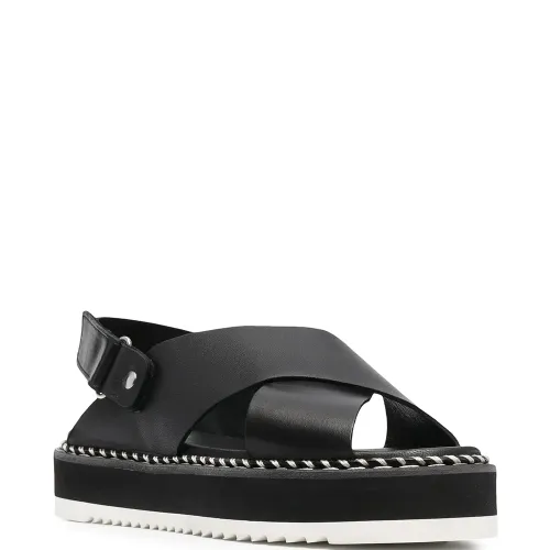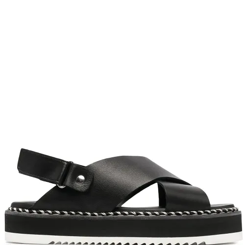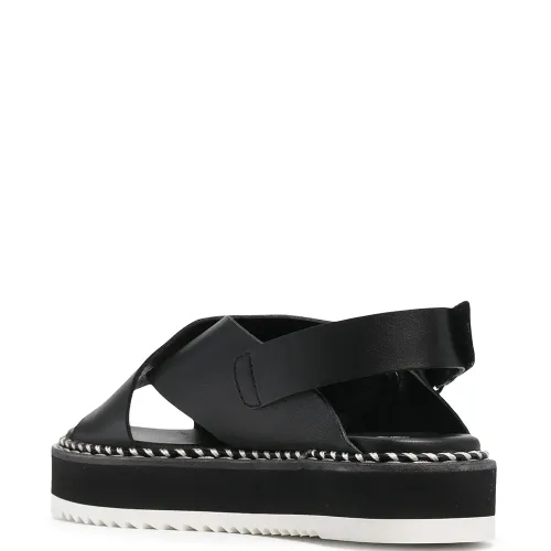 Боковые застежки с пряжками, перекрестные ремешки, открытый носок, стелька с логотипом и контрастная строчка. Цвет: черный.