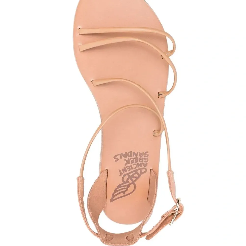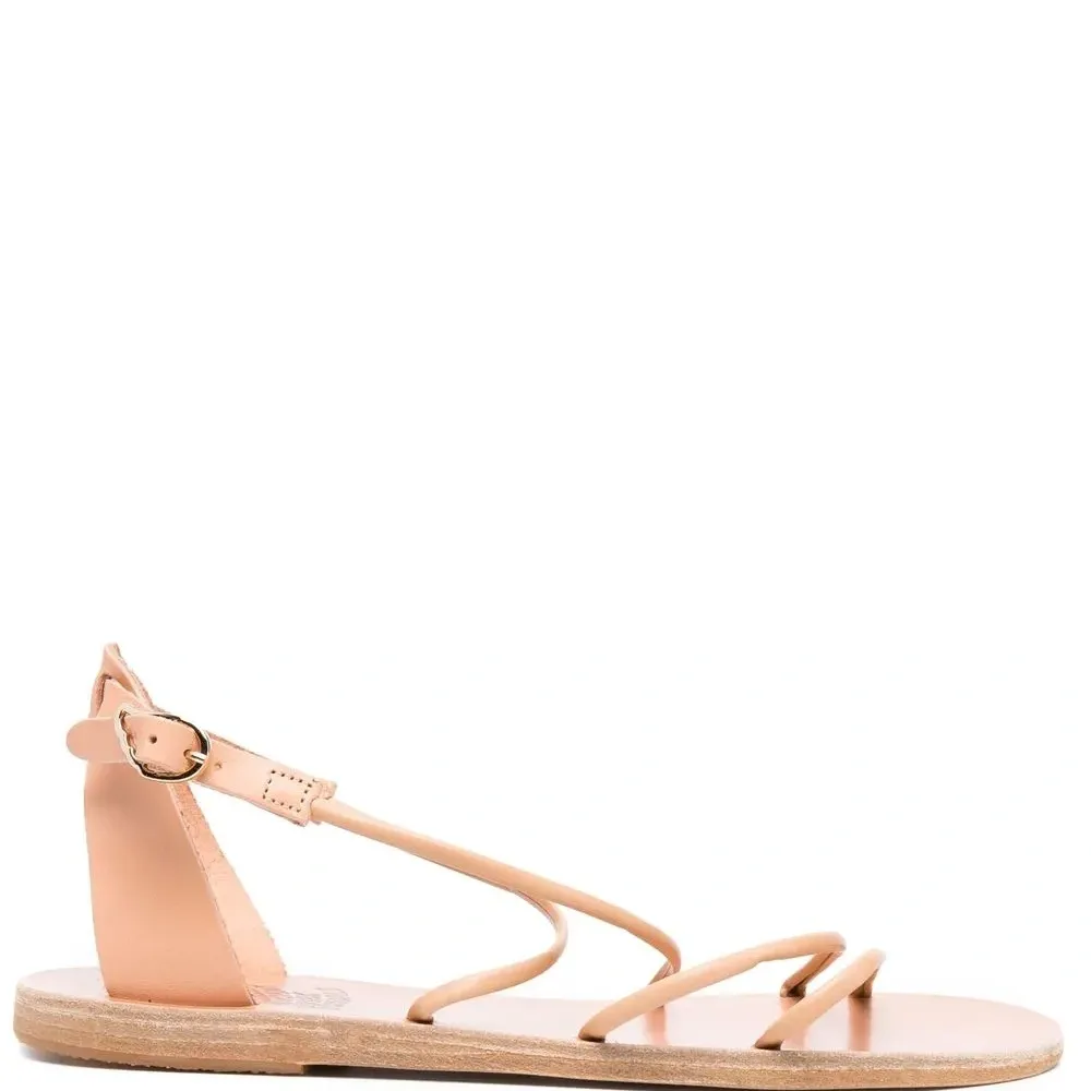 Бежевый, телячья кожа, открытый носок, несколько вариантов крепления ремня, застежка на пряжке и плоская кожаная подошва.