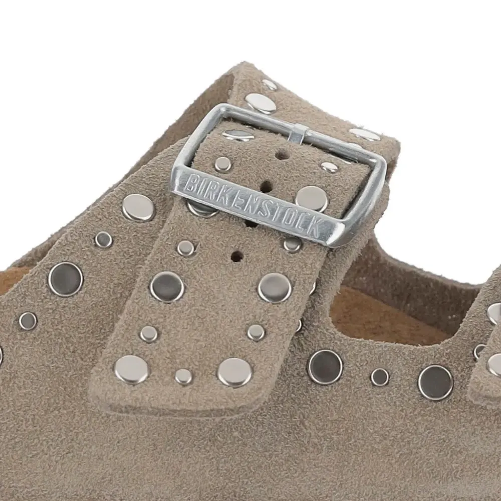 верх из светло-коричневой замши, регулируемые ремешки, верх с отделкой заклёпками, открытый носок