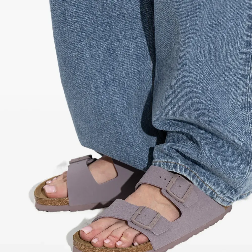 выцветший фиолетовый, стелька из пробки, застёжка на ремешке, однотонная фурнитура, открытый носок, плоская подошва
