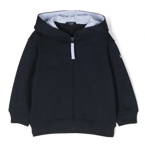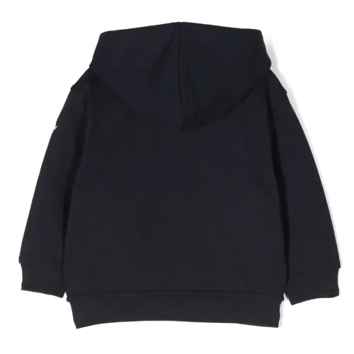 Темно-синий, хлопок, нашивка с логотипом на рукаве, классический капюшон, застежка на молнии спереди, приспущенные плечи, длинные рукава, эластичные манжеты и прямой подол.