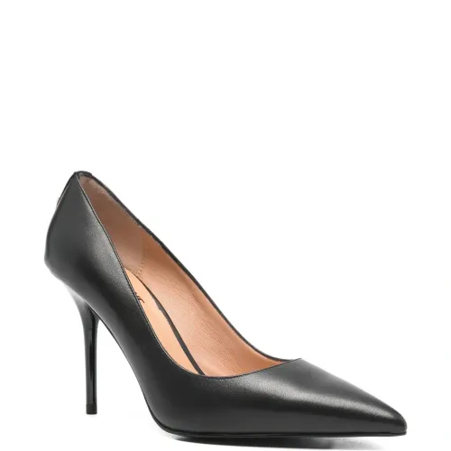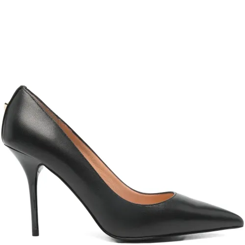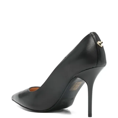 черные туфли с заостренным носком на шпильке с фурнитурой в виде сердца. В комплекте защитный мешочек для хранения.