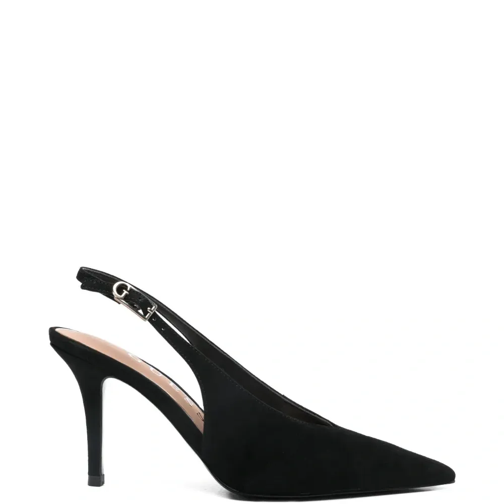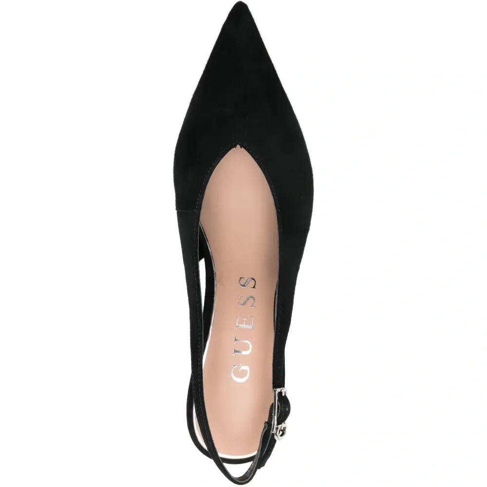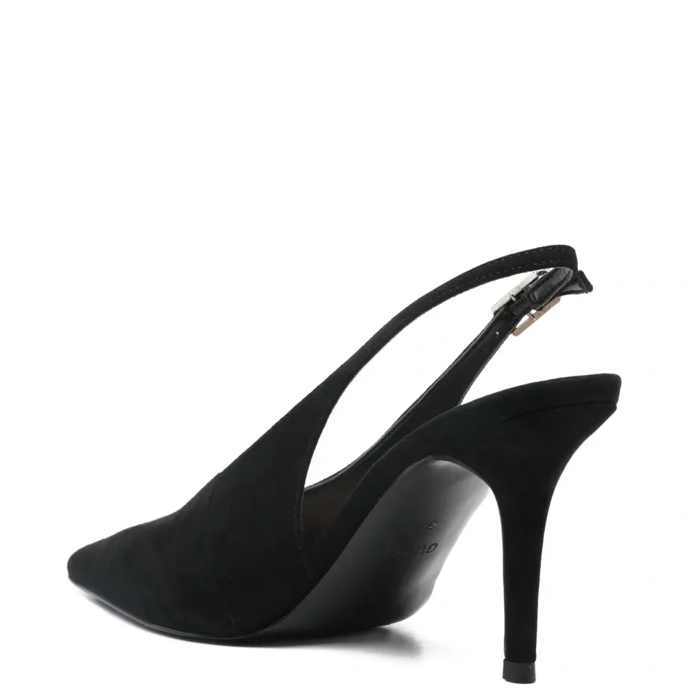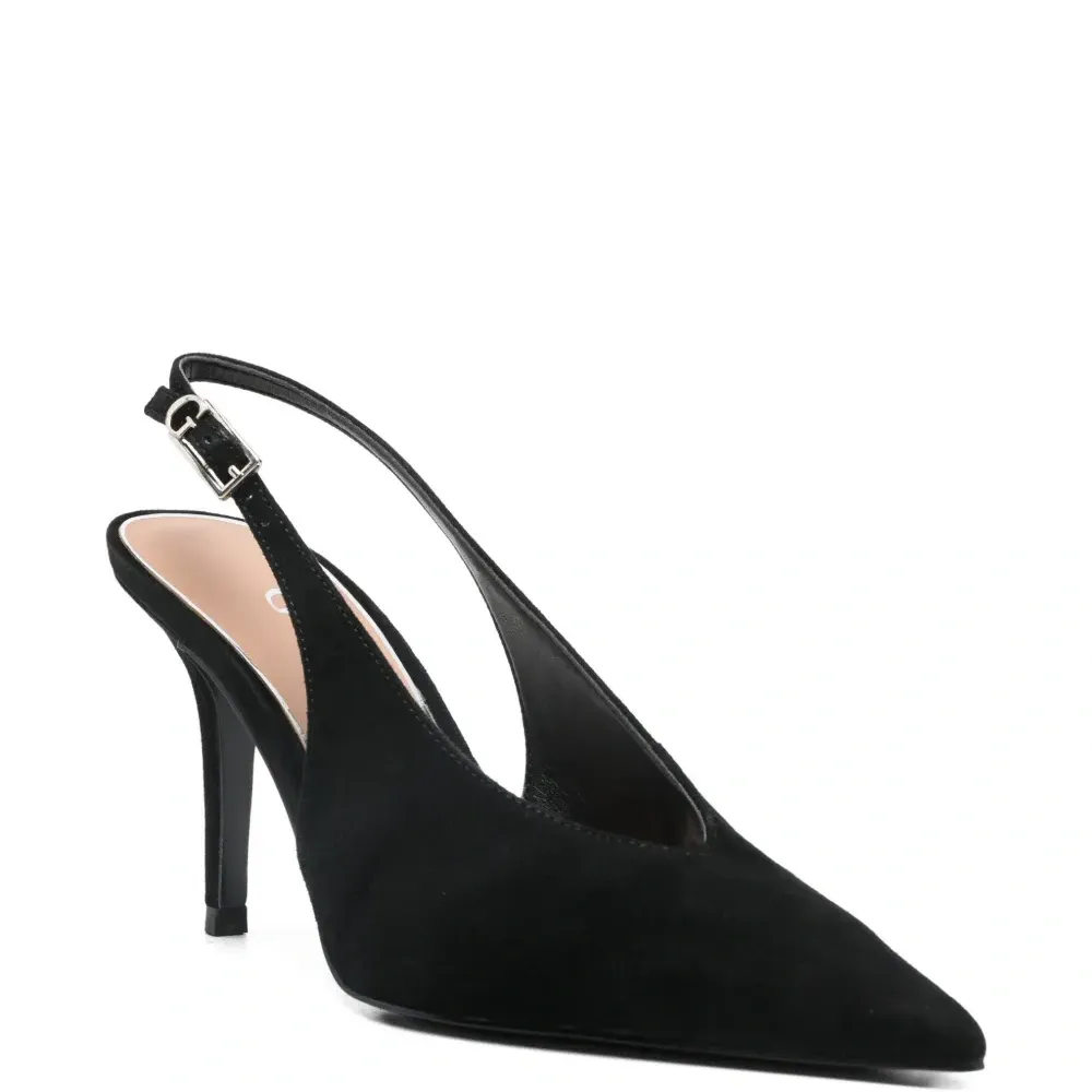 черные туфли с заостренным носком, ремешком на пятке и пряжкой