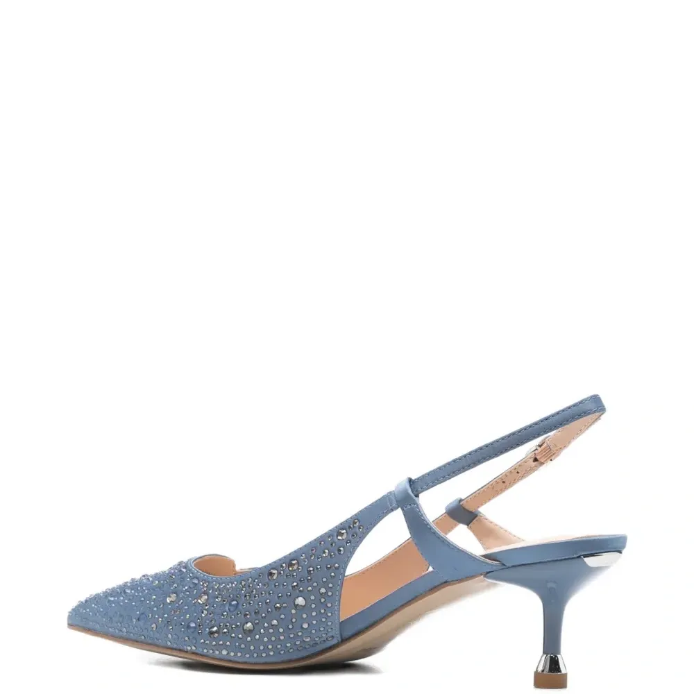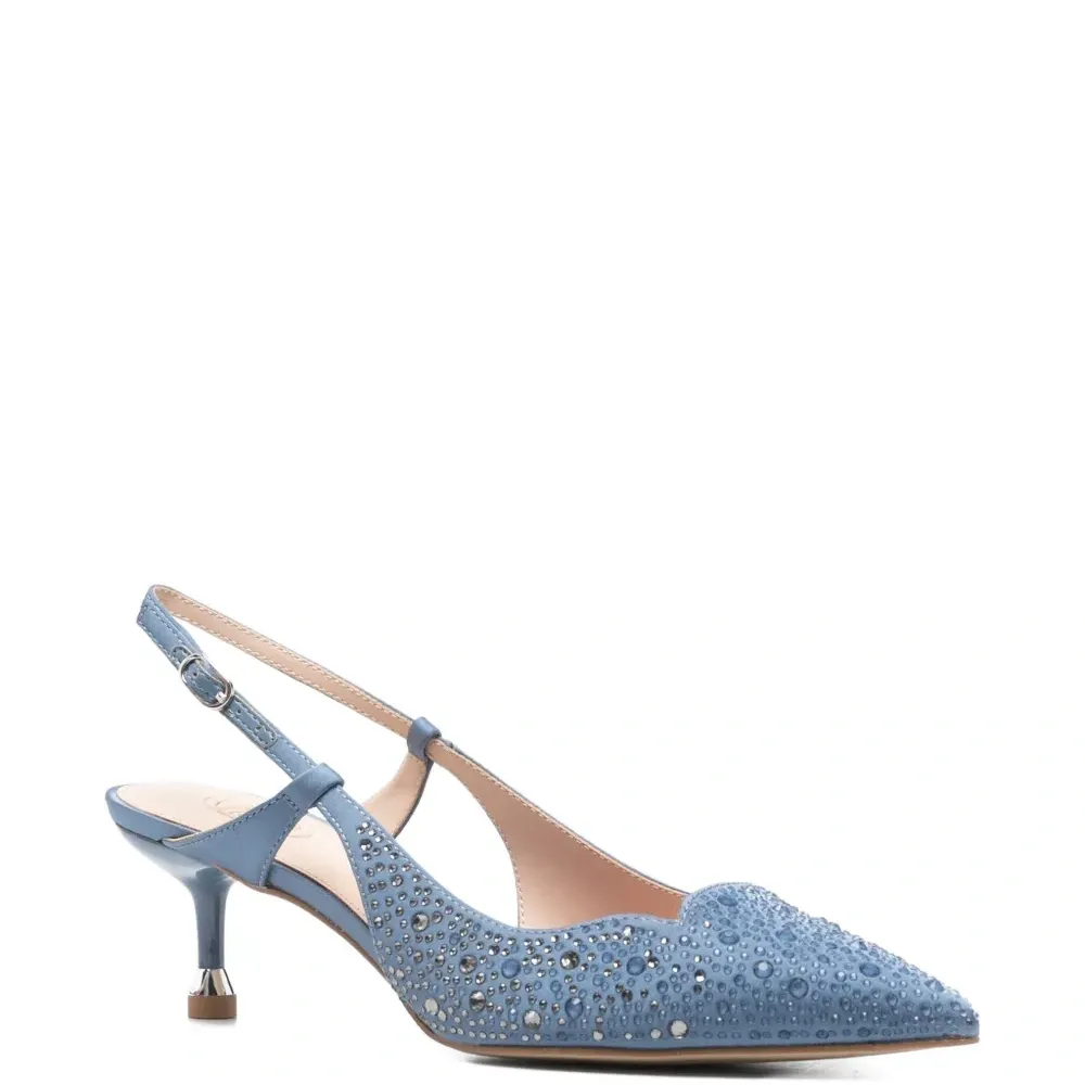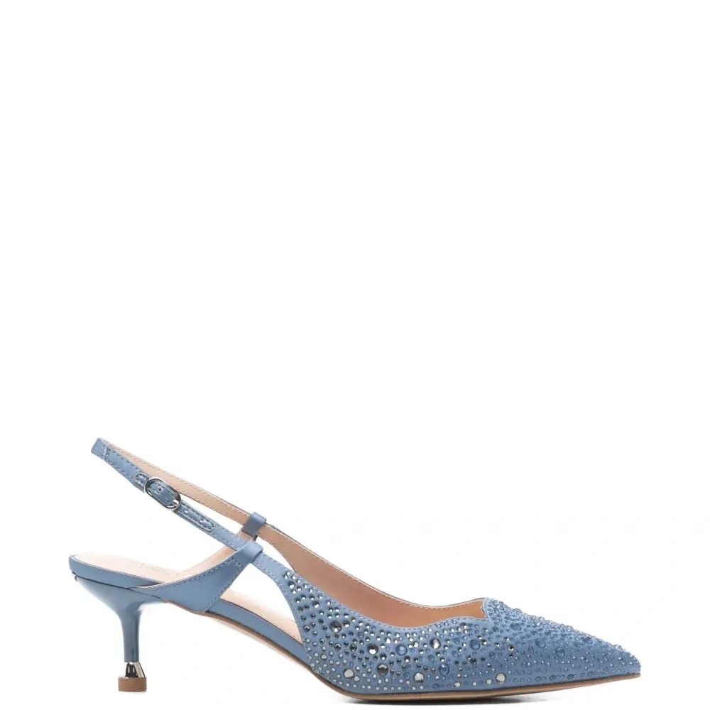 синие кожаные туфли с заострённым носком, украшенные заклёпками, с ремешком на пятке и застёжкой-пряжкой