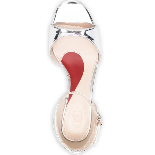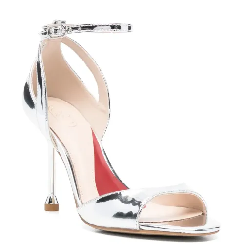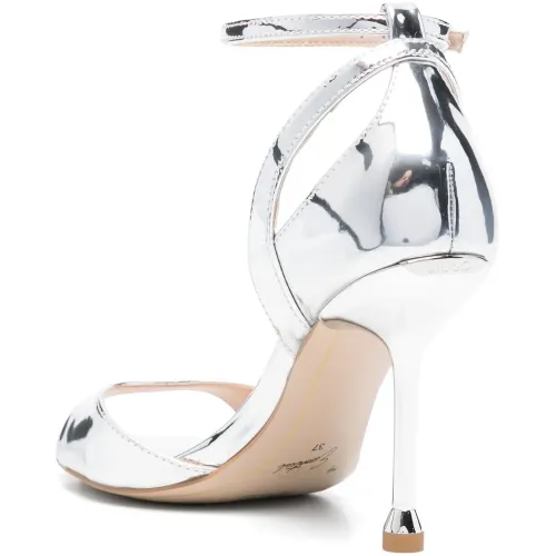 серебристая кожаная босоножка с ремешком на щиколотке, открытым носком, тональной прострочкой и застежкой-пряжкой