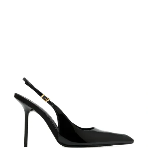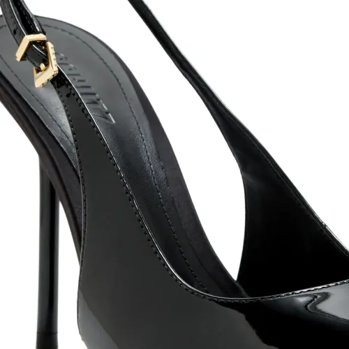 черные туфли-лодочки с острым носком, ремешком на пятке, застежкой-пряжкой и каблуком-шпилькой