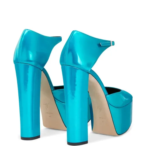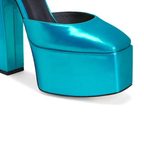 Лазурно-синий, кожа, глянцевая фактура, квадратный носок, ремешок на щиколотке с пряжкой, подошва на платформе и высокий блочный каблук.