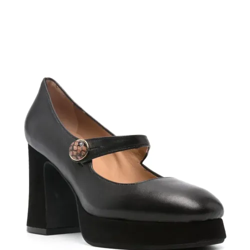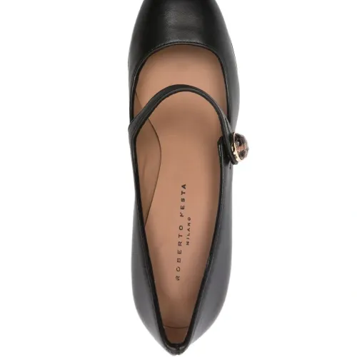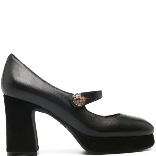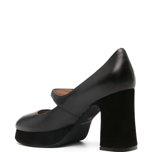 Черный, телячья кожа, закругленный носок, бретели с застежками на пуговицах, кожаная стелька с логотипом и высокий блочный каблук.