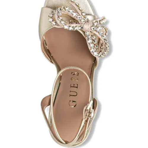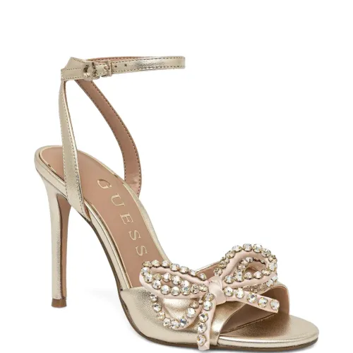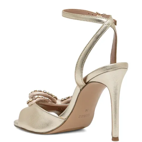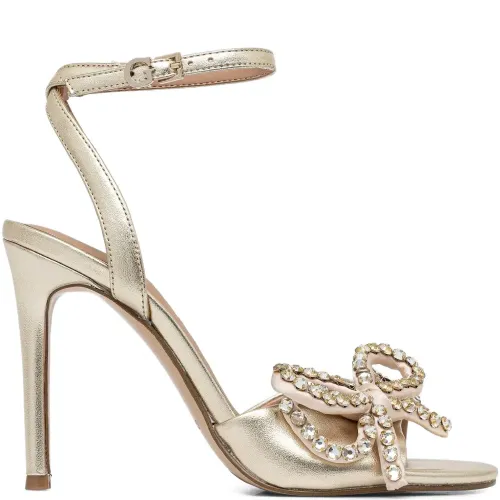 золотые босоножки с открытым носком, ремешком на щиколотке с пряжкой, шпилькой, бантом и отделкой из кристаллов