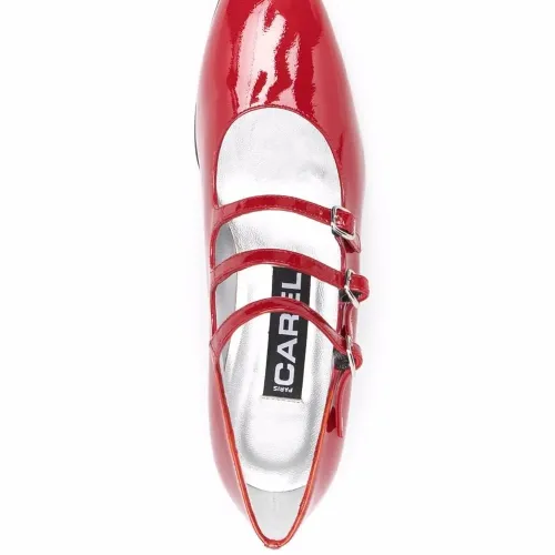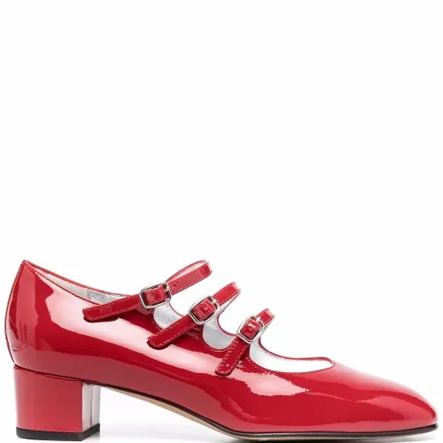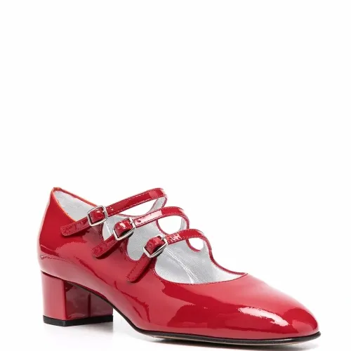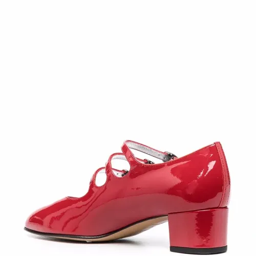 Лакированная кожа, боковые застежки с пряжками, квадратный носок, стелька с логотипом и каблук средней высоты.