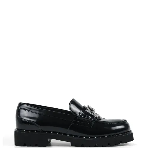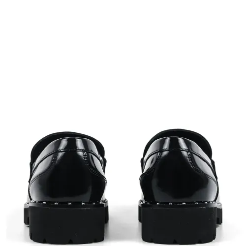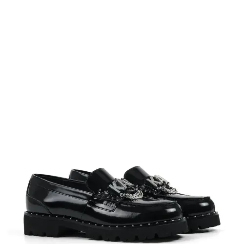 черные лоферы с логотипом, цепочным декором, отделкой металлическими заклепками, массивной подошвой и дизайном без застежки