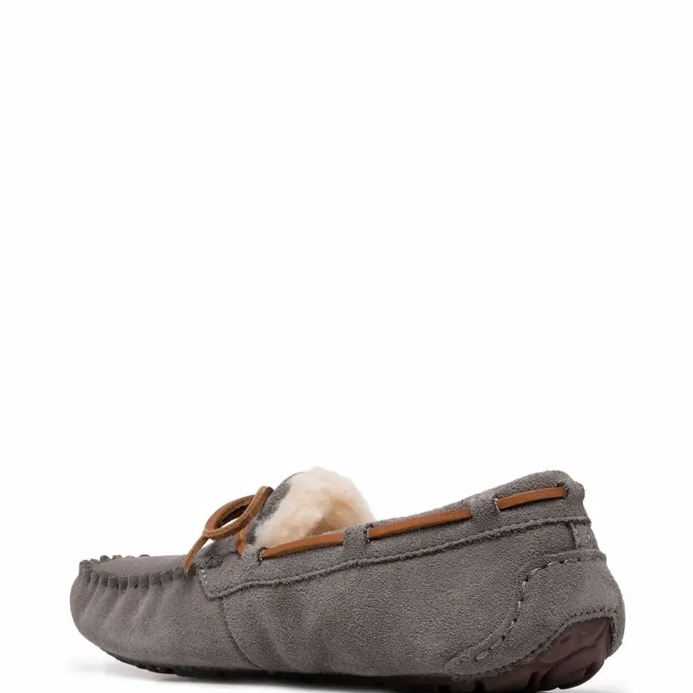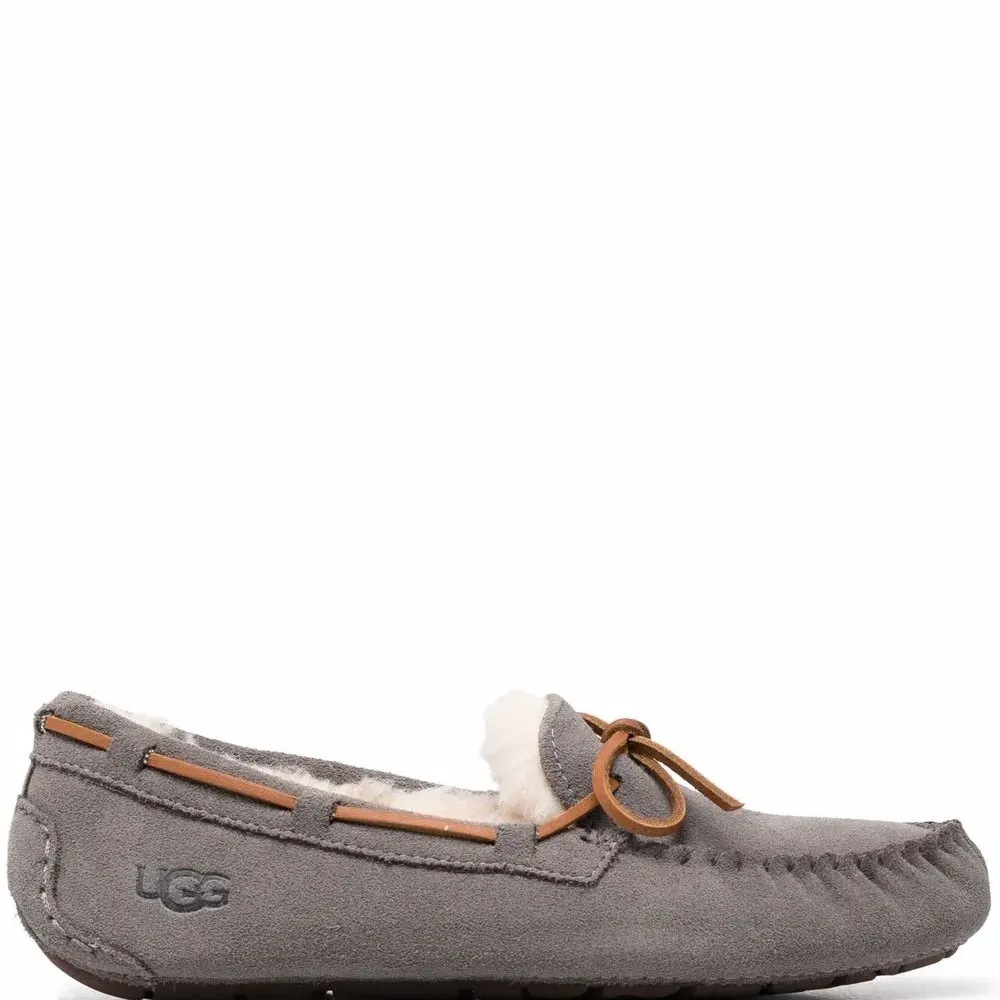 Подкладка из овечьей шерсти, логотип сбоку, бант, модель без застежки, закругленный носок, плоская резиновая подошва и стелька с логотипом. Цвет: серый.