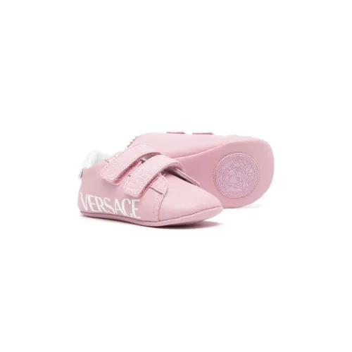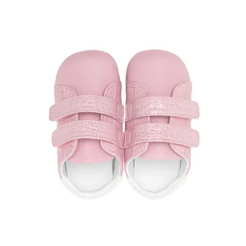 Светло-розовый, кожа, тиснение под кожу рептилии, логотип сбоку, контрастный задник, закругленный носок, застежка на липучке спереди и логотип на подошве.