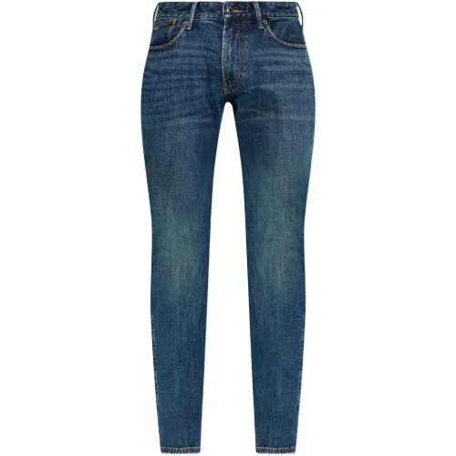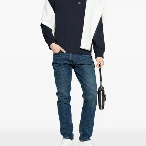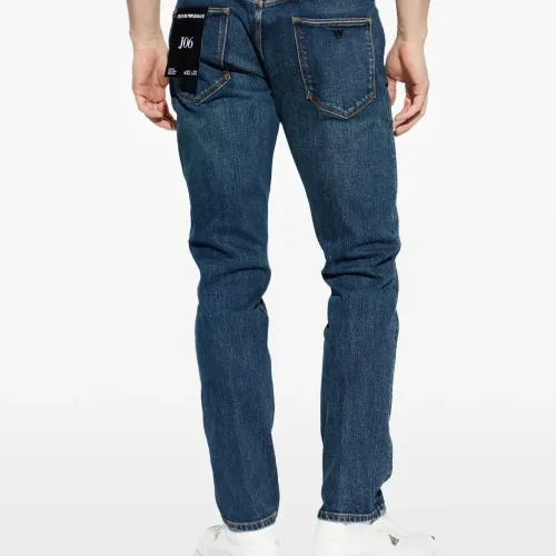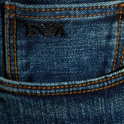 синие джинсы с логотипом и пятью карманами