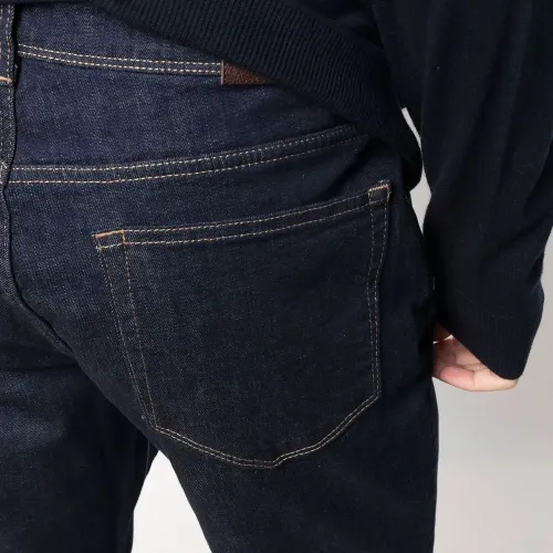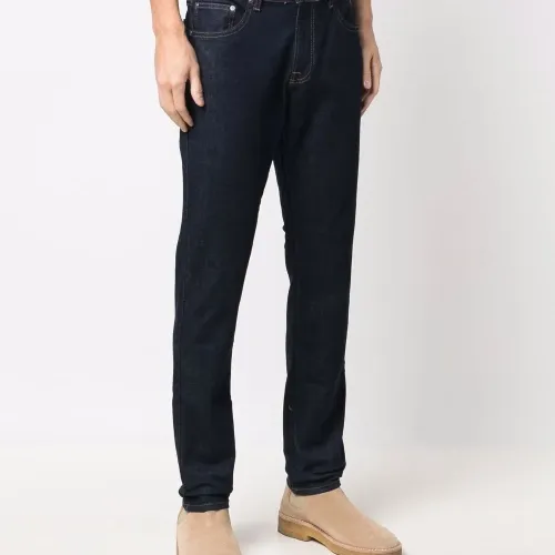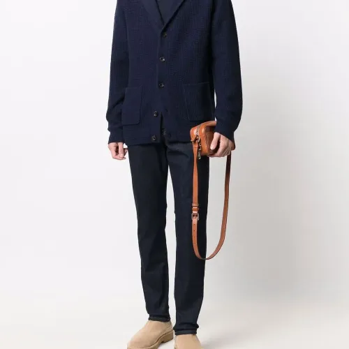 Петли для ремня, застежка на молнии и пуговице спереди и классическая пятикарманная модель.