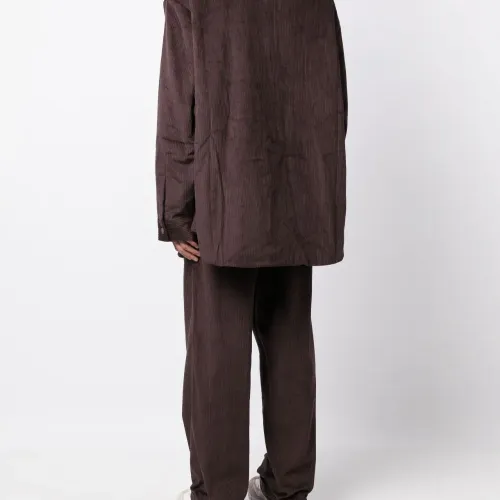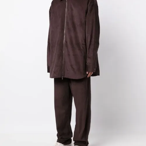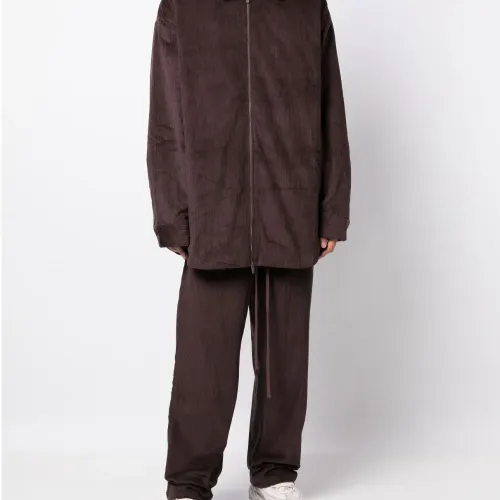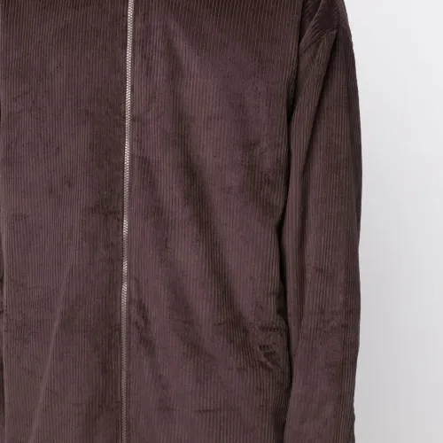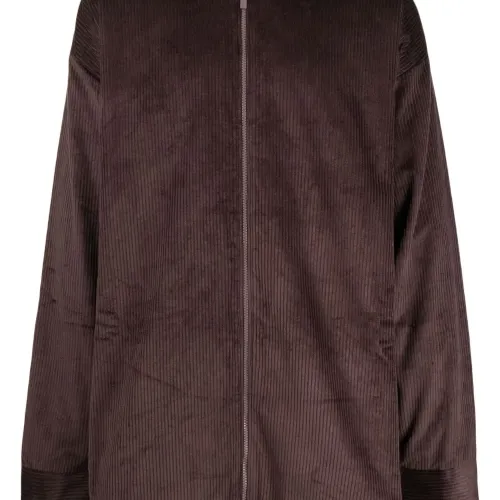 Шоколадный, хлопок, вельветовый материал, классический воротник, застежка на молнии спереди, длинные рукава и закругленный подол.