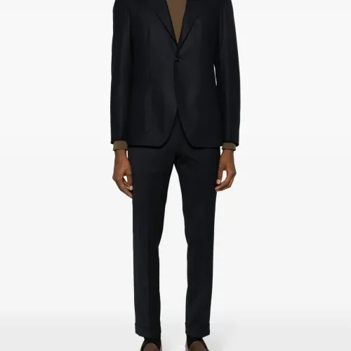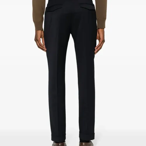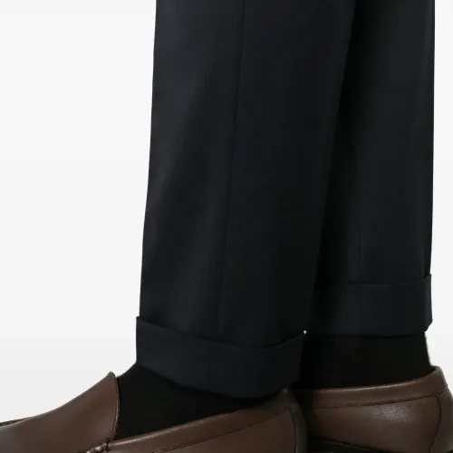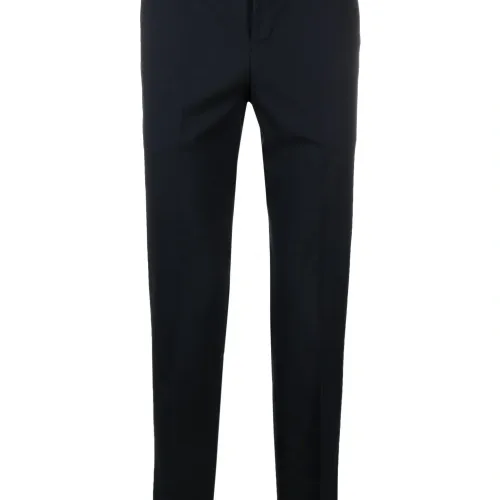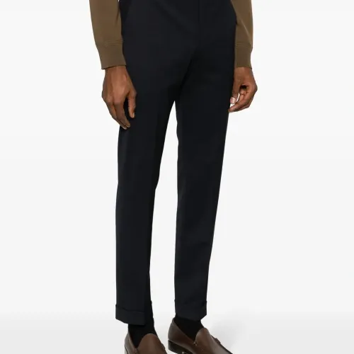 Темно-синий, эластичный материал, средняя посадка, потайная застежка спереди, петли для ремня, два вшитых кармана по бокам, два кармана с клапанами сзади, узкий крой и подвороты.