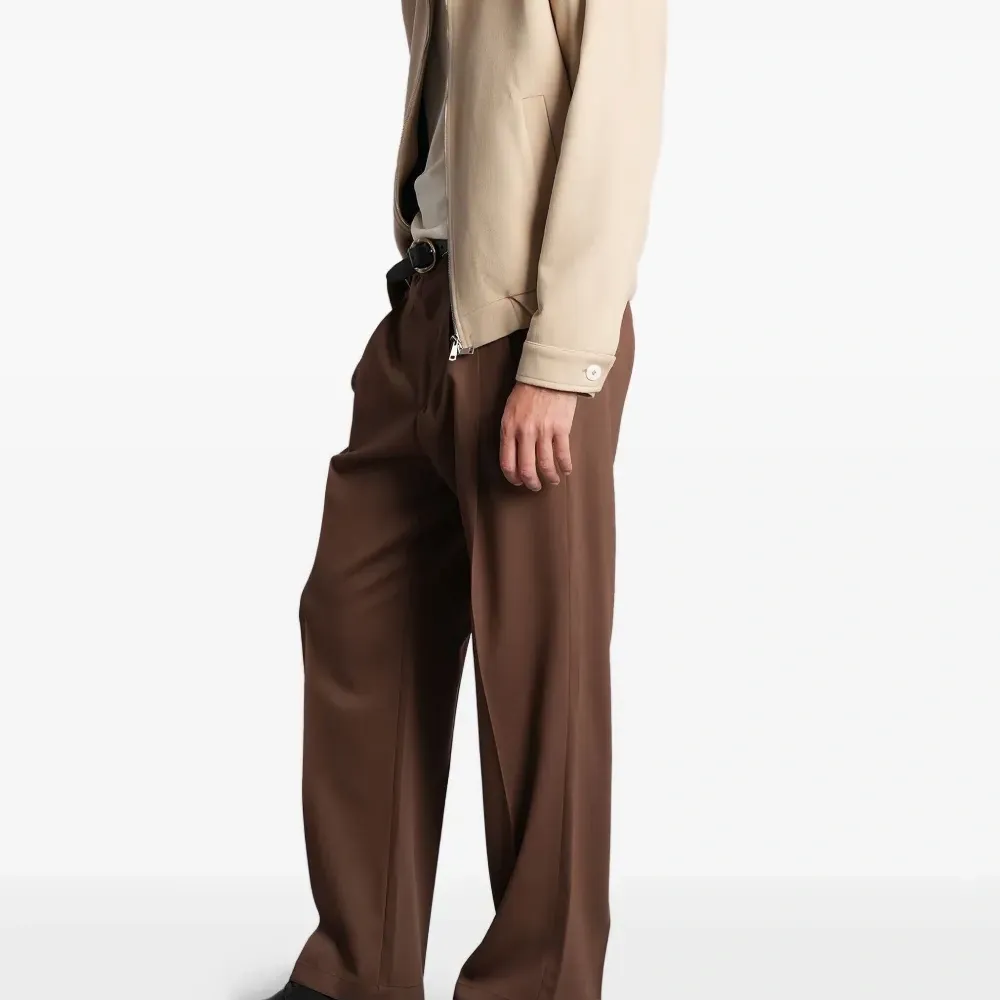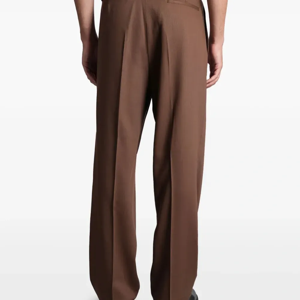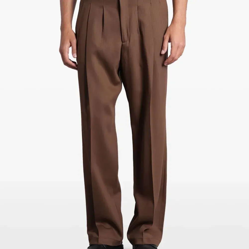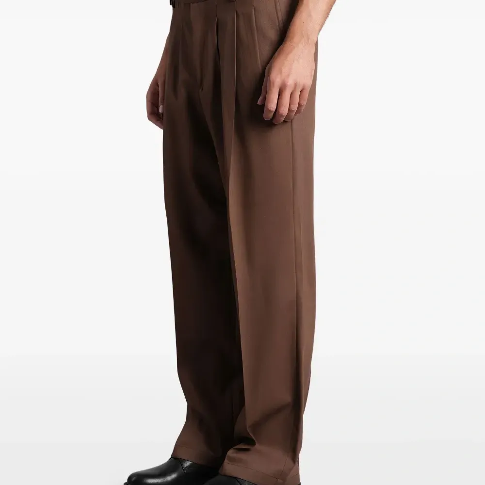 коричневые плиссированные брюки, шлевки для ремня, застежка на пуговицу, боковые карманы в шве, задний прорезной карман