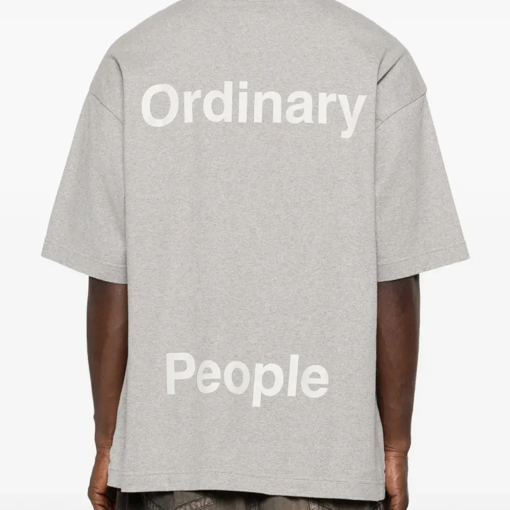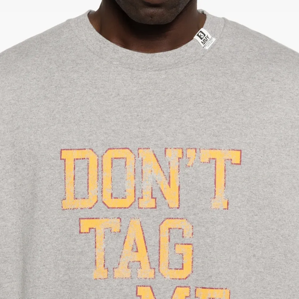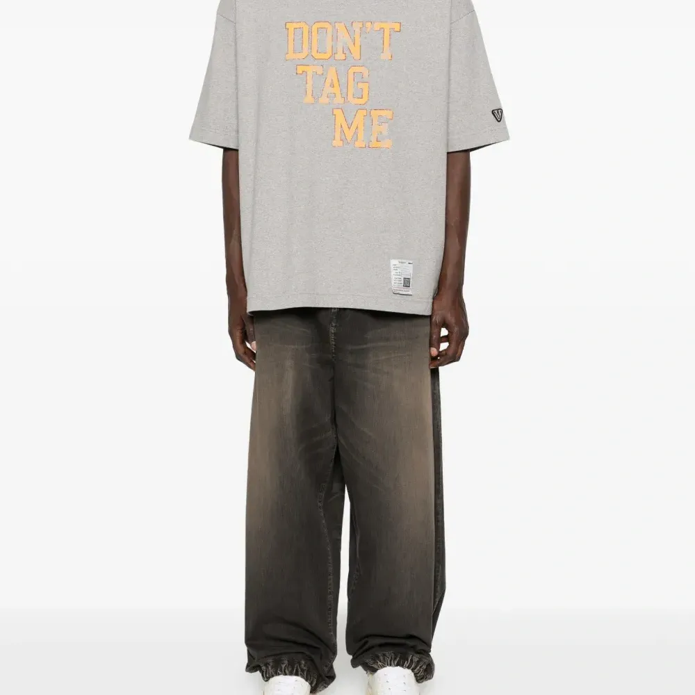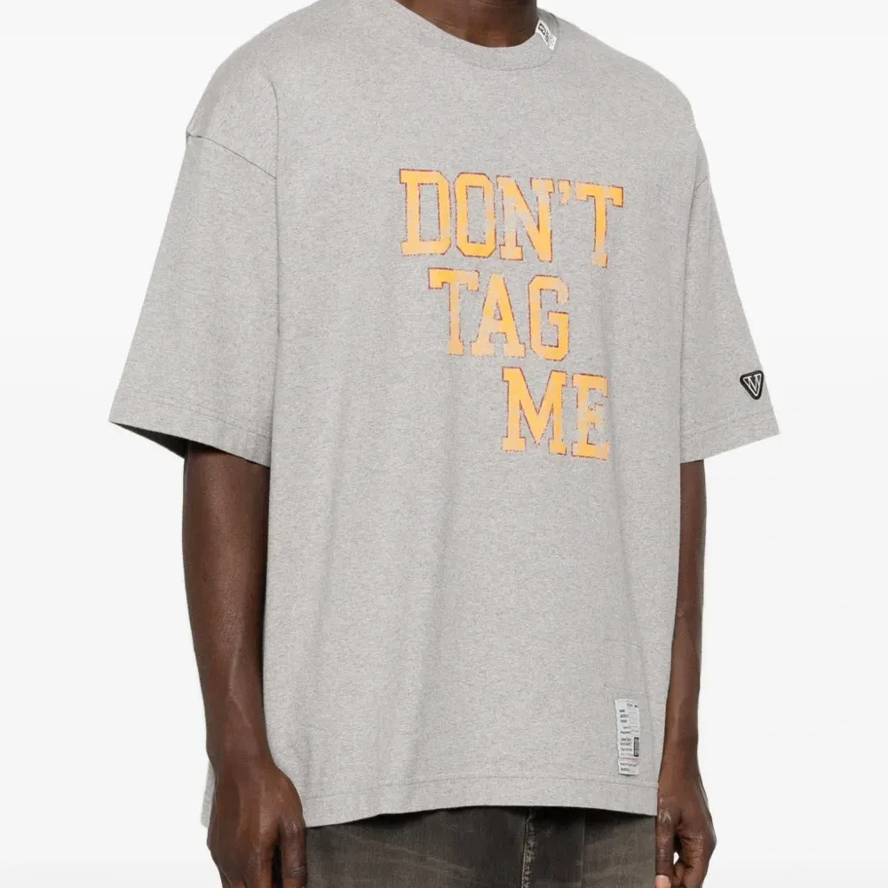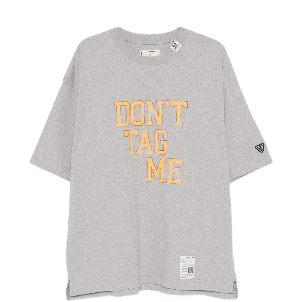 серый топ с текстовым принтом, нашивкой с логотипом на рукаве, короткими рукавами и прямым подолом