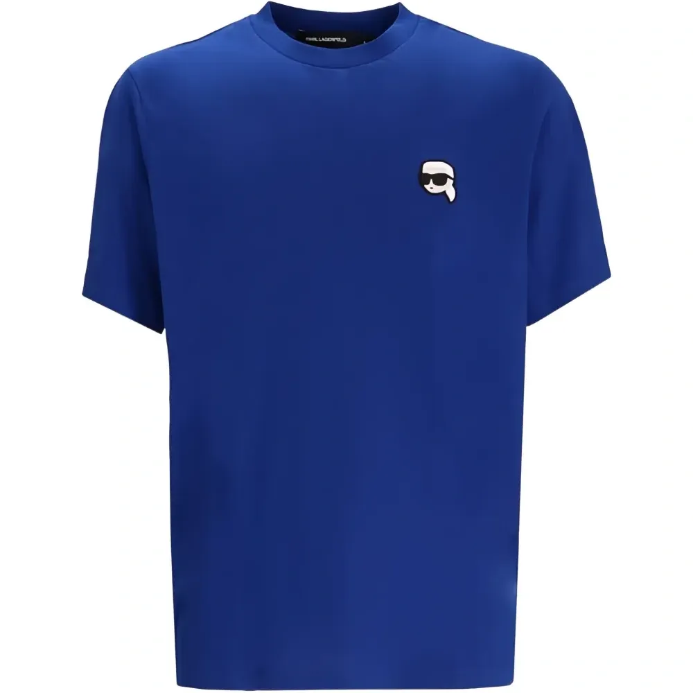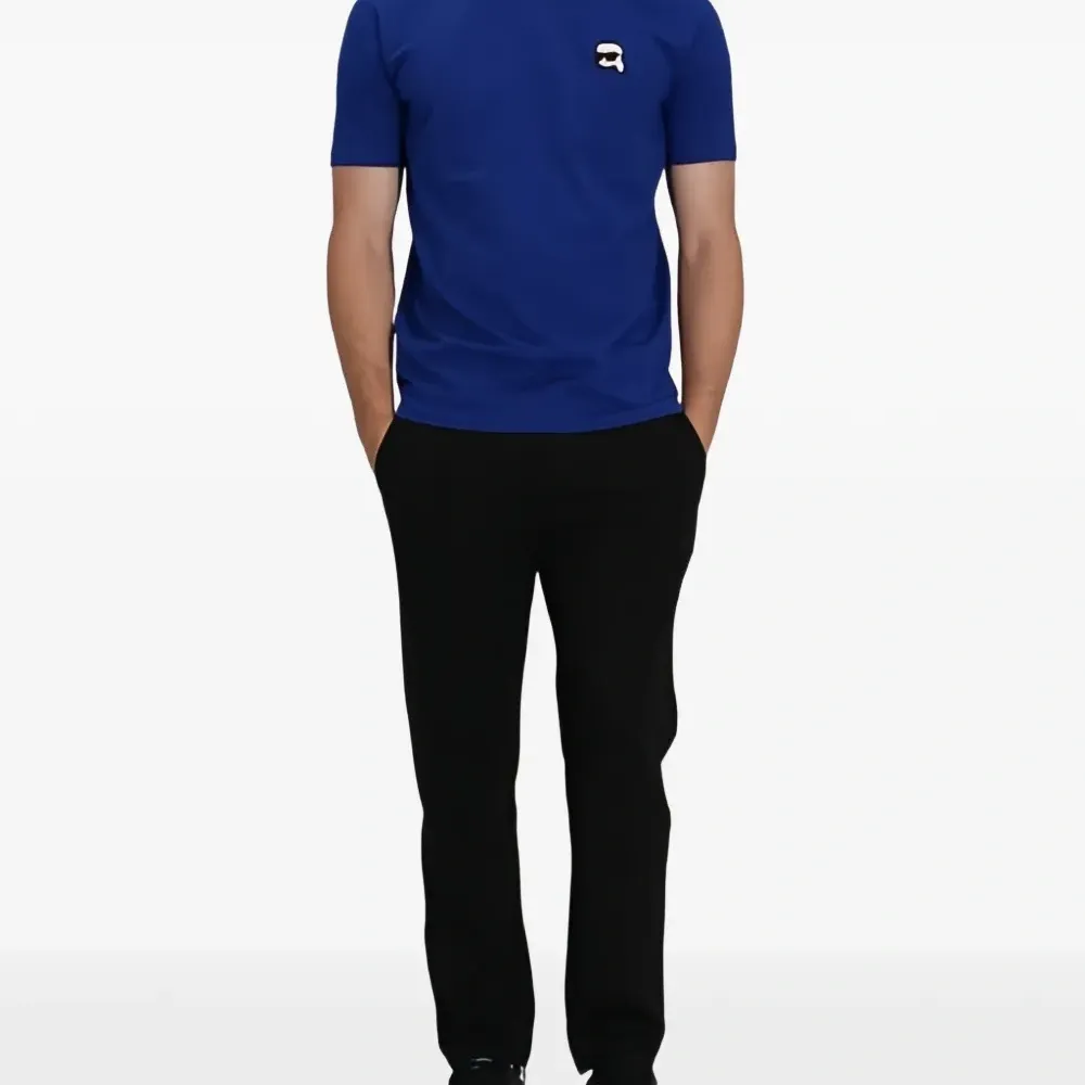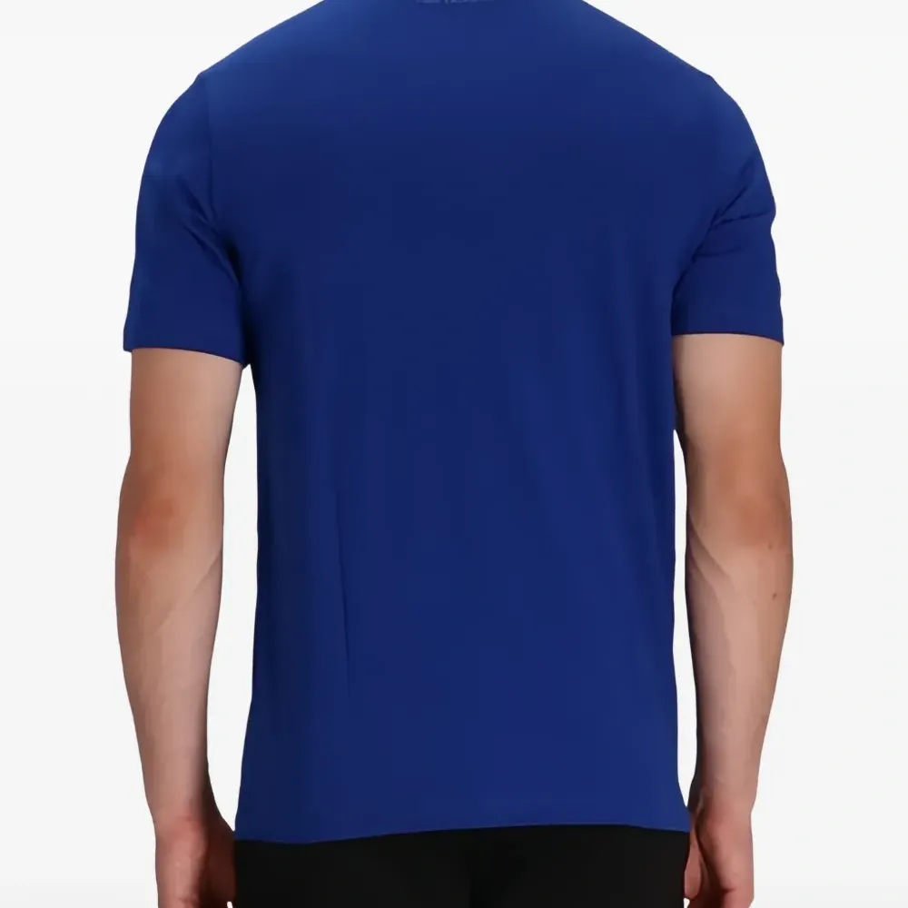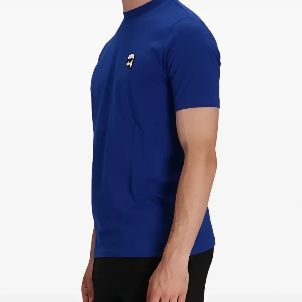 ярко-синяя футболка с круглым вырезом, нашивкой-логотипом и короткими рукавами