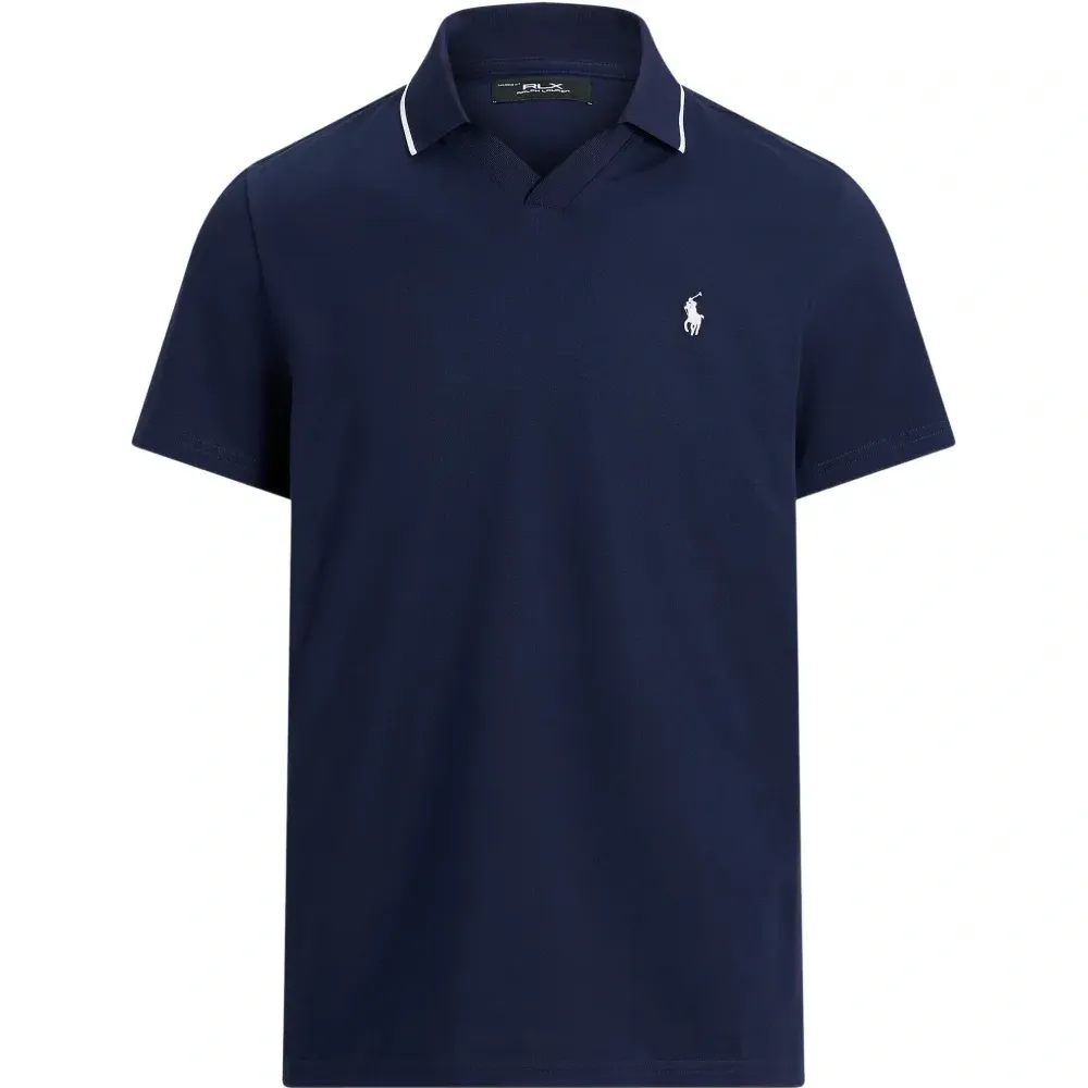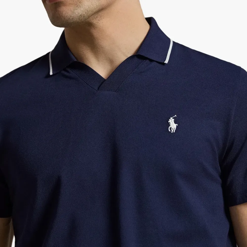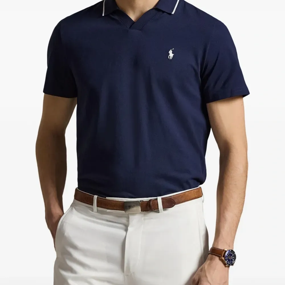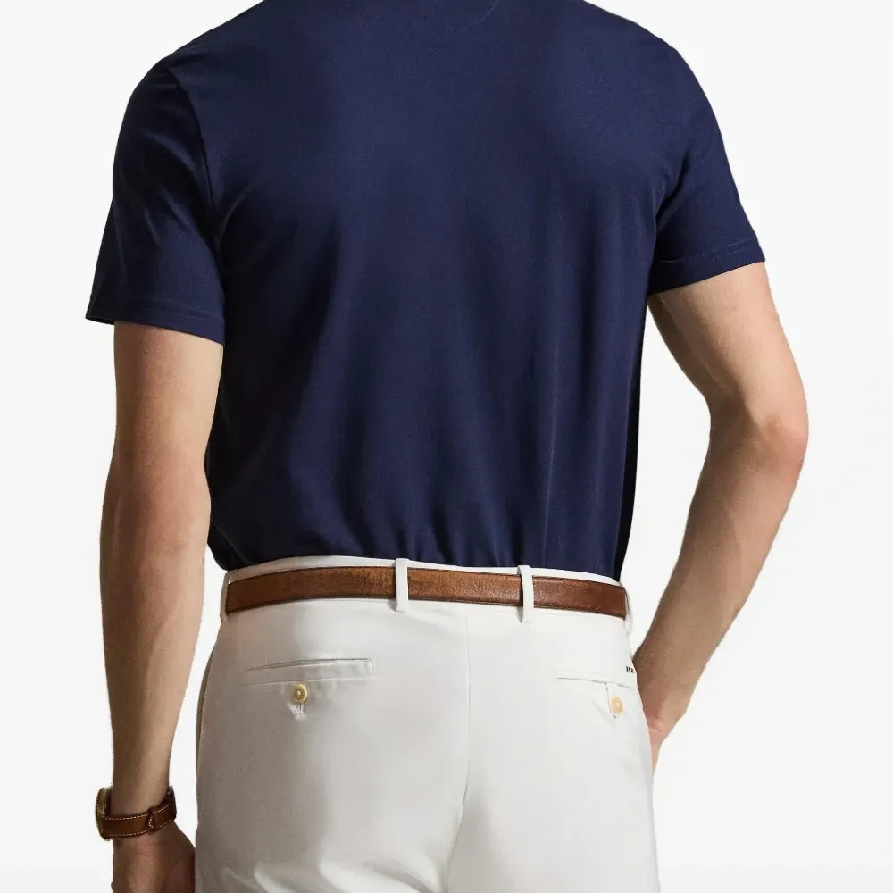 темно-синяя футболка с V-образным вырезом, короткими рукавами и логотипом