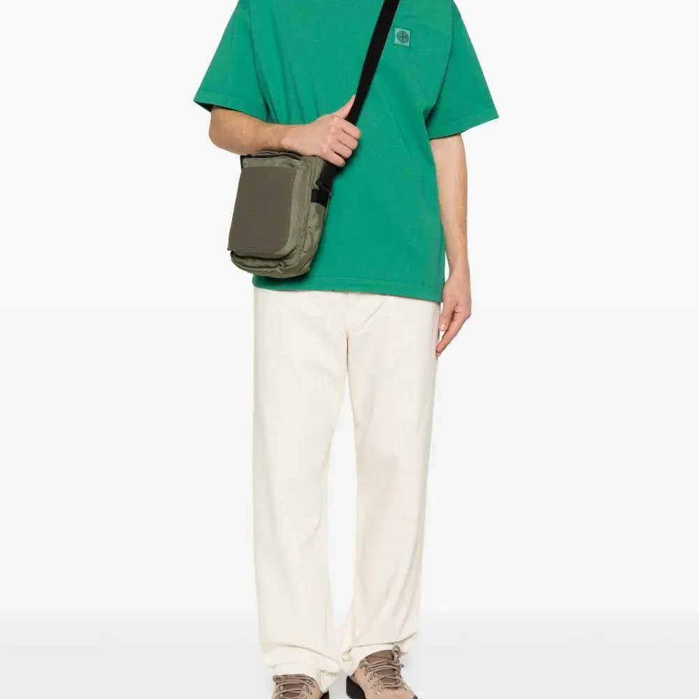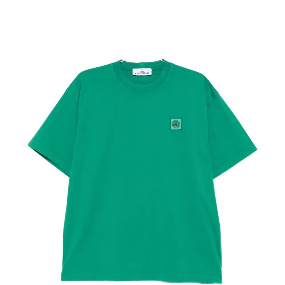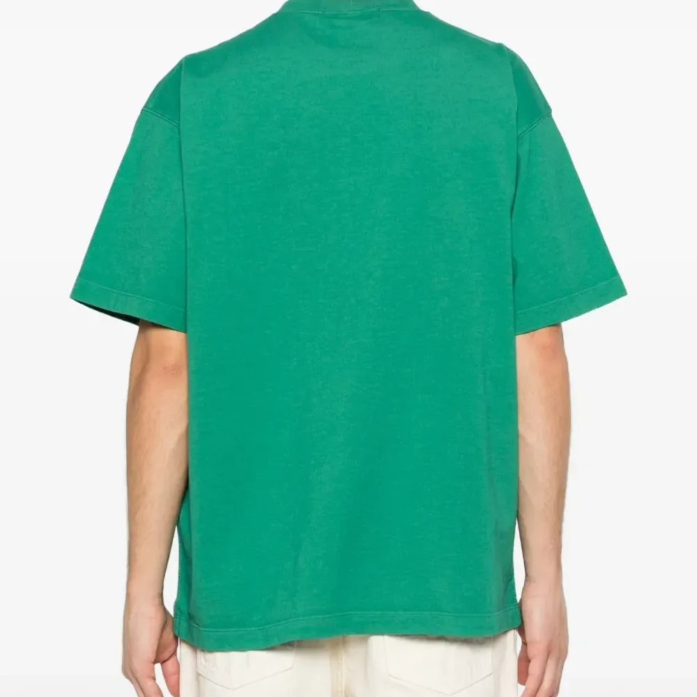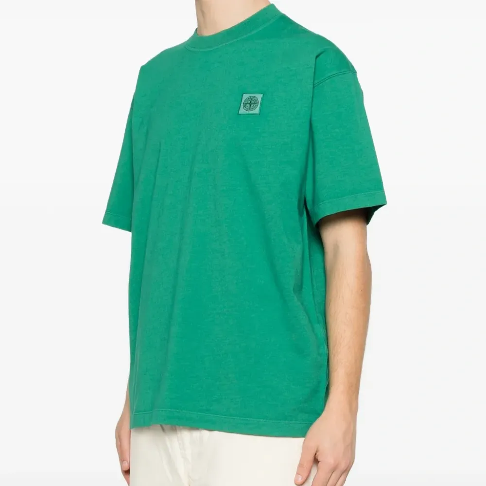 зеленый топ с круглым вырезом, короткими рукавами и нашивкой с логотипом
