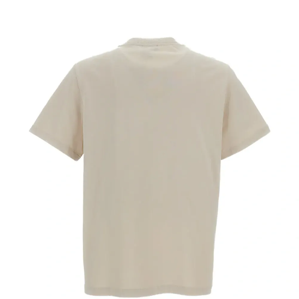 бежевая футболка с принтом логотипа, короткими рукавами, круглым вырезом и прямым подолом