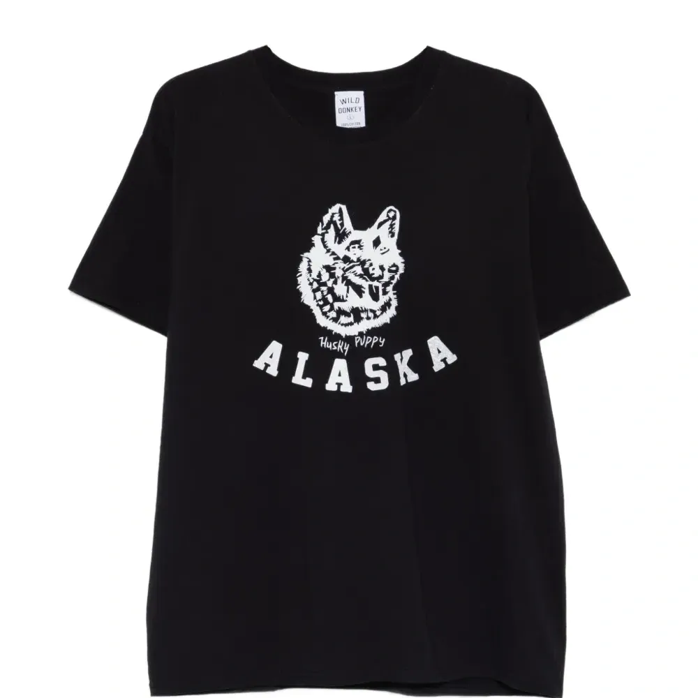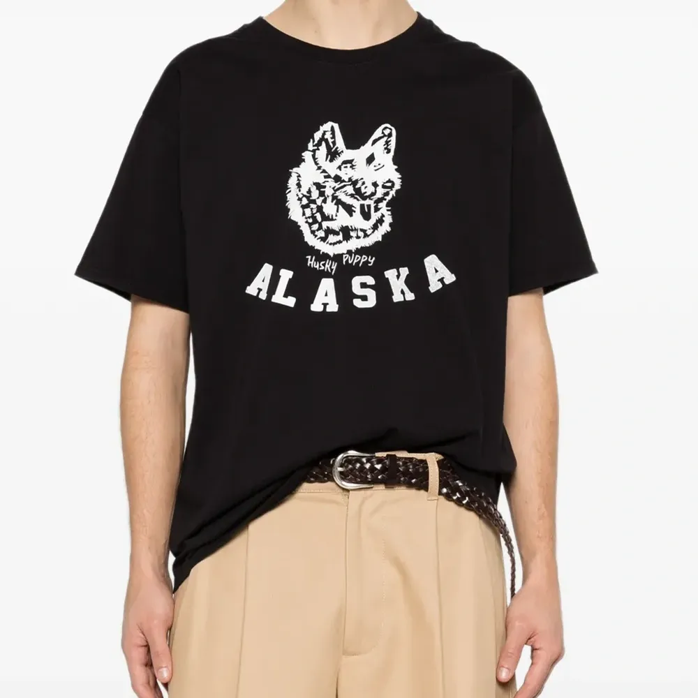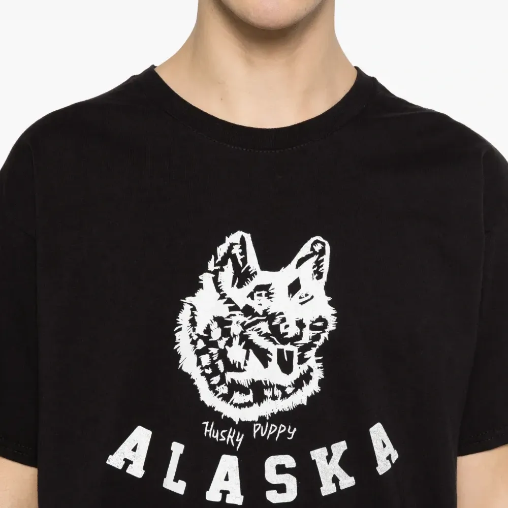 черная футболка с графическим принтом, короткими рукавами и круглым вырезом
