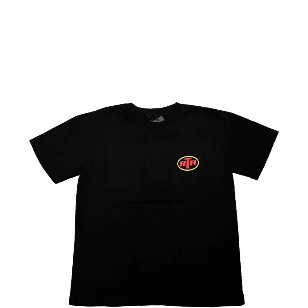 чёрная футболка с короткими рукавами, принтом логотипа на спине, круглый вырез
