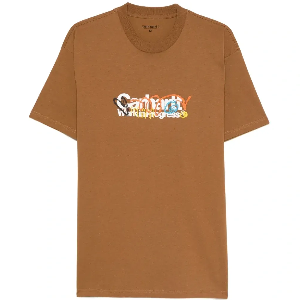 коричневая футболка с круглым вырезом, короткими рукавами, графичным принтом и прямым подолом