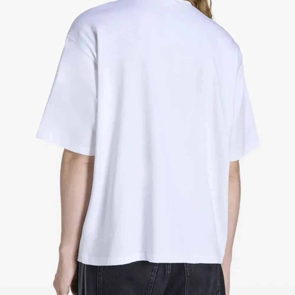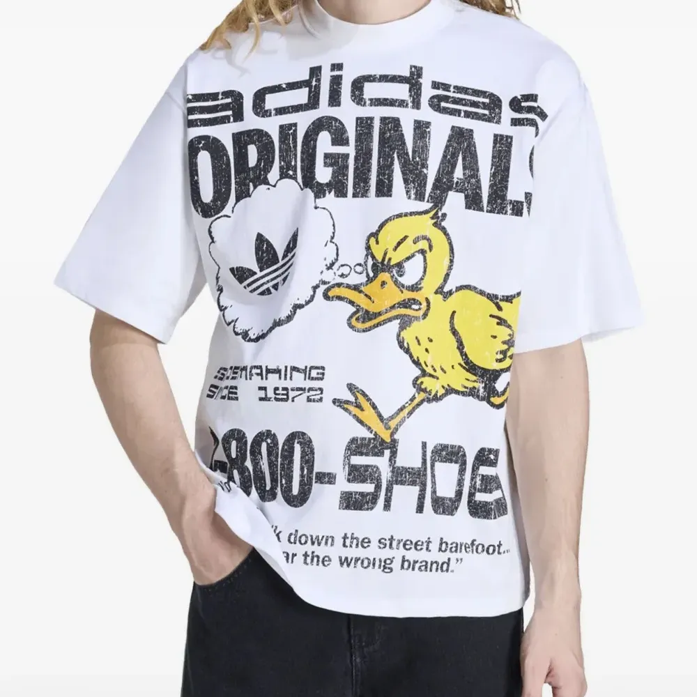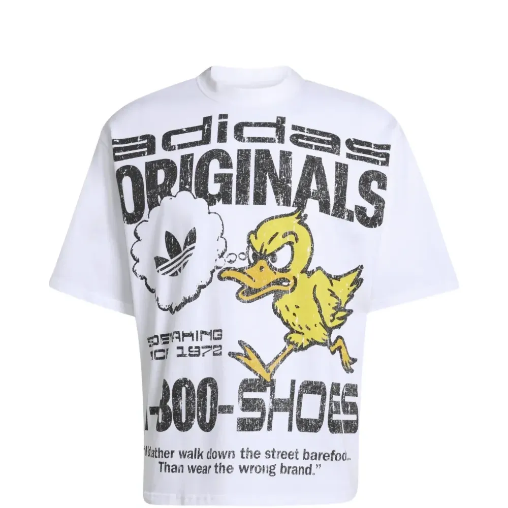 белая футболка с графическим принтом, круглым вырезом, короткими рукавами и свободным кроем