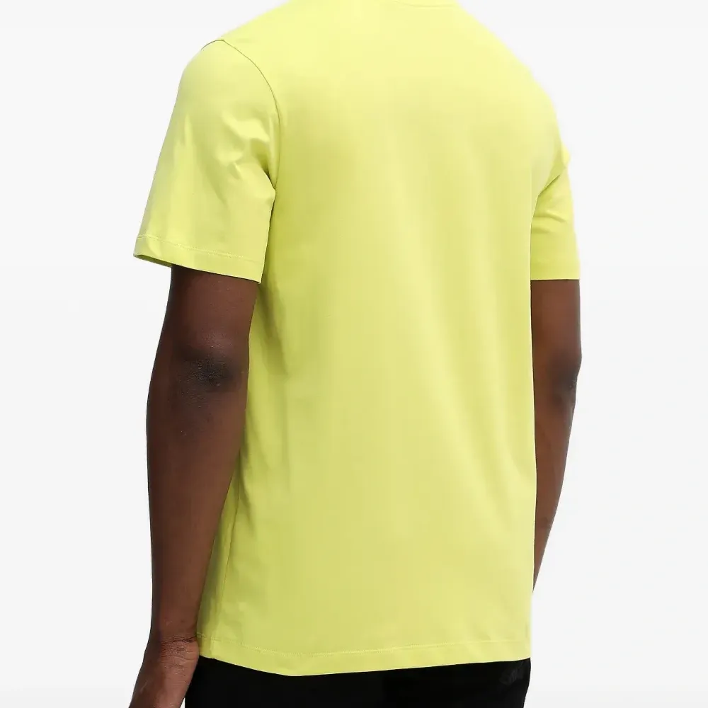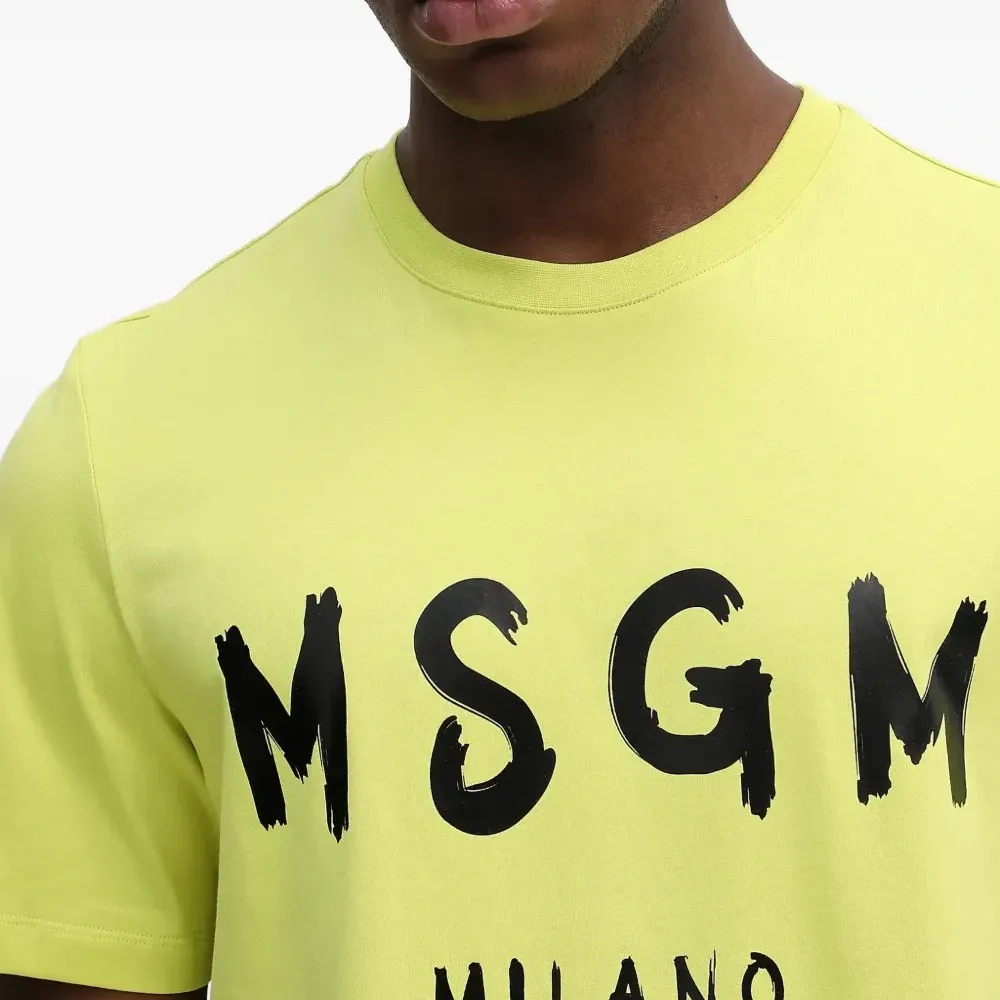 жёлтая футболка с логотипом, круглым вырезом и короткими рукавами