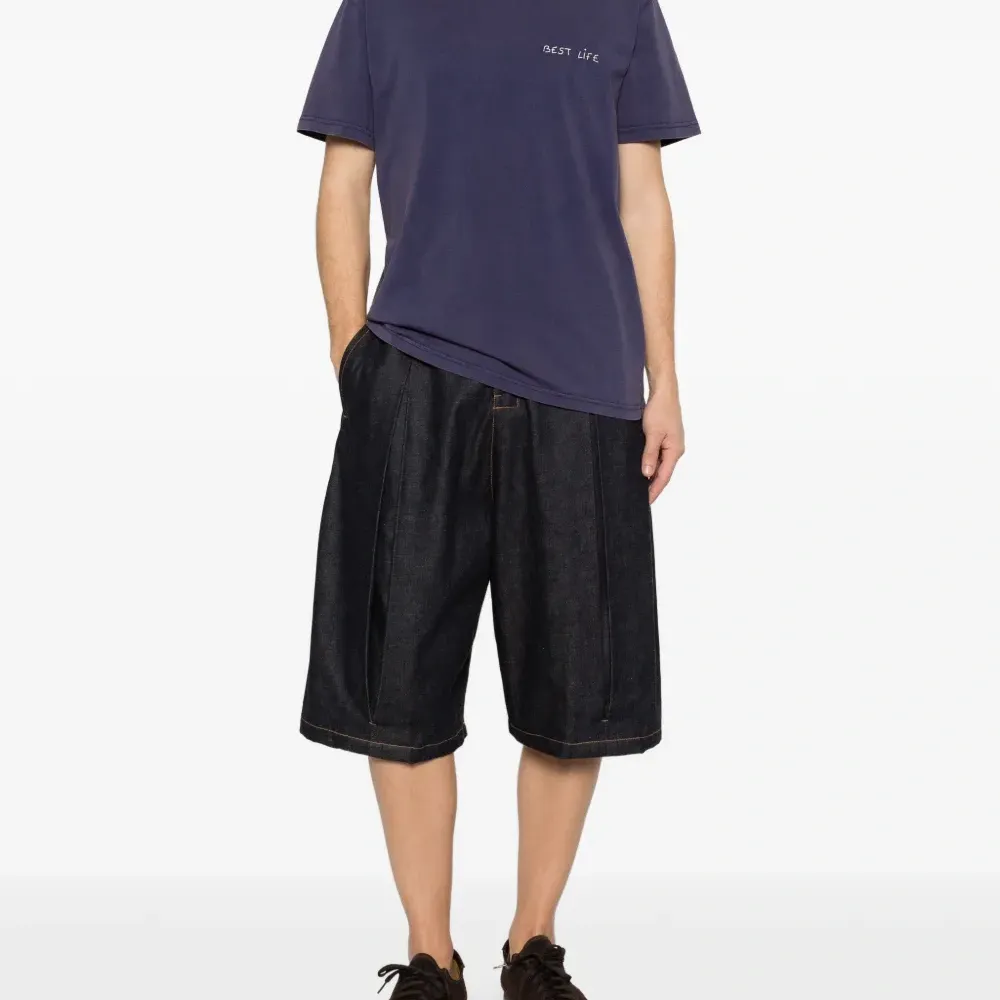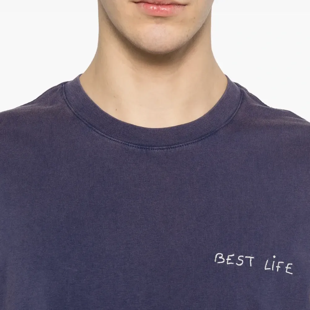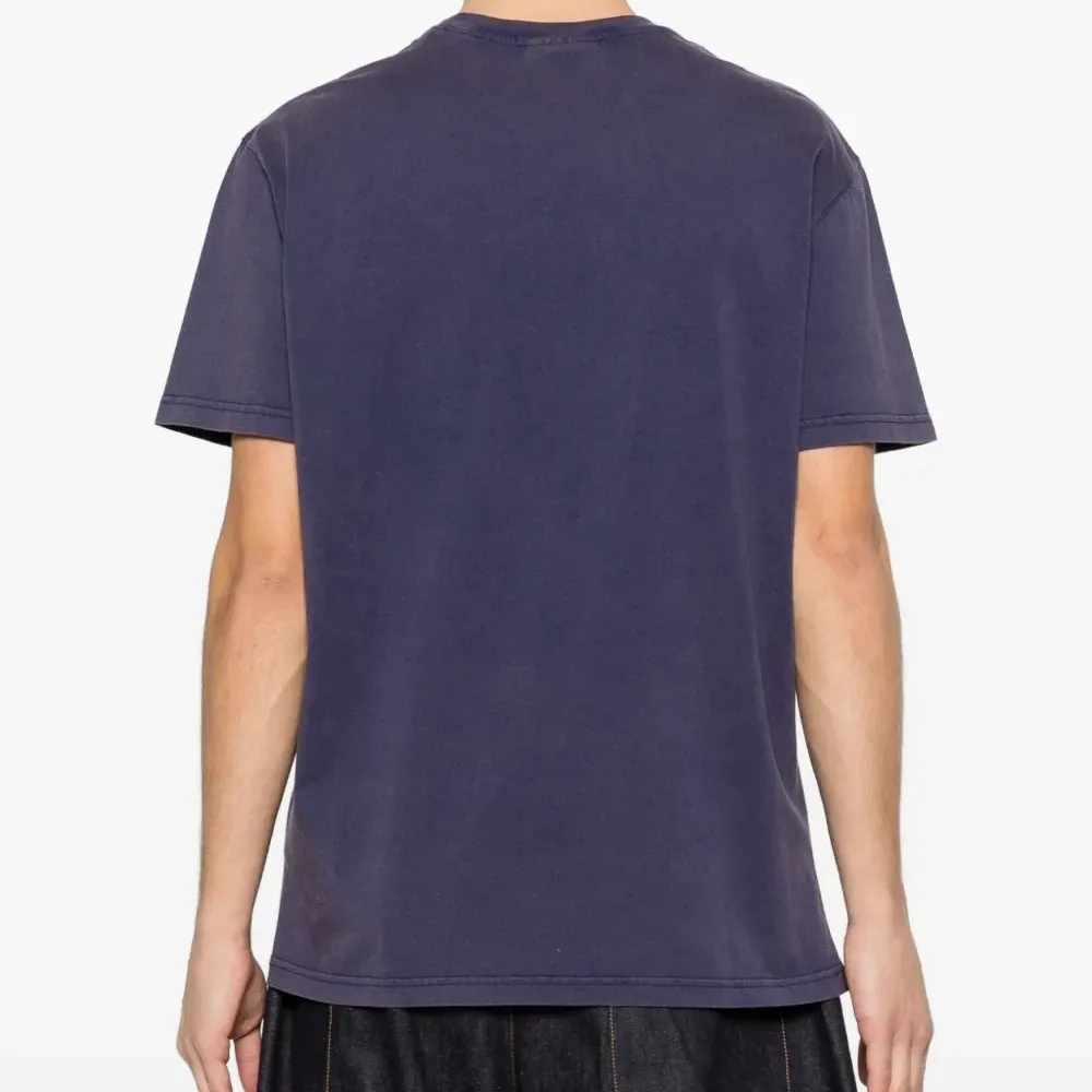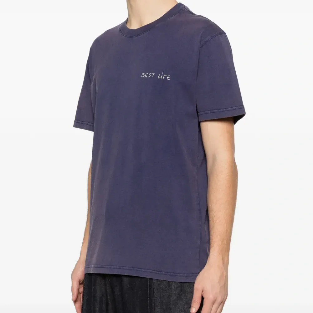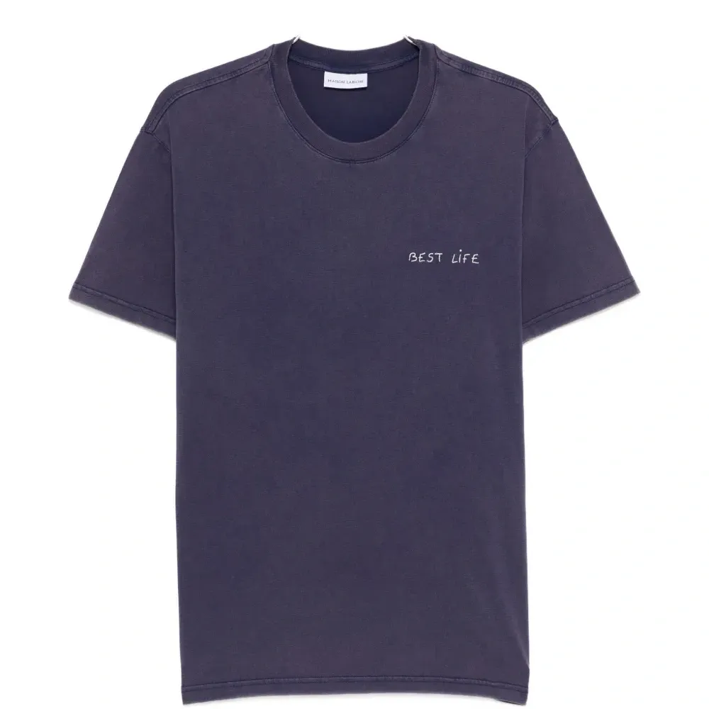 тёмно-синяя футболка с круглым вырезом, короткими рукавами, эффектом состаривания и вышитыми деталями